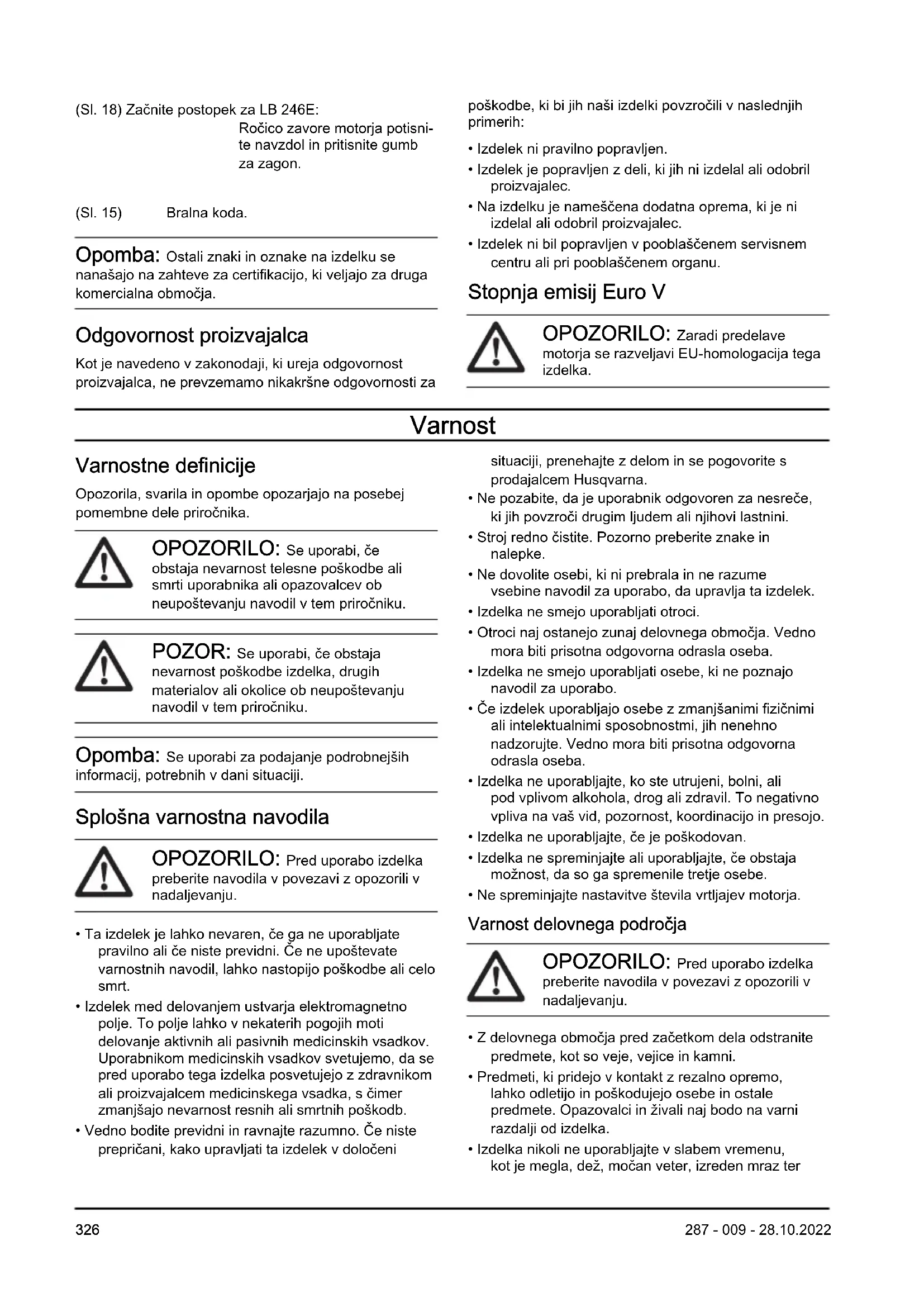 - Izdelek ni bil popravljen v pooblaščenem servisnem centru ali pri pooblaščenem organu. Stopnja emisij Euro V OPOZORILO: Zaradi predelave motorja se razveljavi EU-homologacija tega izdelka. Varnost Varnostne definicije Opozorila, svarila in opombe opozarjajo na posebej pomembne dele priročnika. OPOZORILO: Se uporabi, če obstaja nevarnost telesne poškodbe ali smrti uporabnika ali opazovalcev ob neupoštevanju navodil v tem priročniku. POZOR: Se uporabi, če obstaja nevarnost poškodbe izdelka, drugih materialov ali okolice ob neupoštevanju navodil v tem priročniku. Opomba: Se uporabi za podajanje podrobnejših informacij, potrebnih v dani situaciji. Splošna varnostna navodila OPOZORILO: Pred uporabo izdelka preberite navodila v povezavi z opozorili v nadaljevanju.