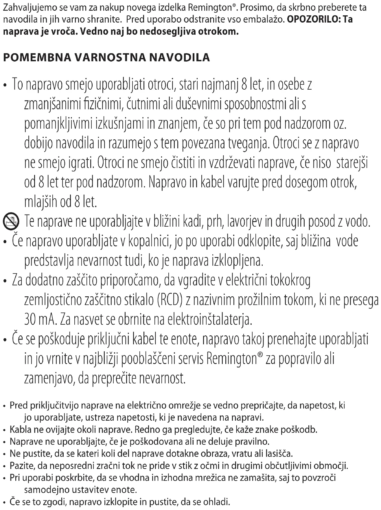 - Če se poškoduje priključni kabel te enote, napravo takoj prenehajte uporabljati in jo vrnite v najbližji pooblaščeni servis Remington® za popravilo ali zamenjavo, da preprečite nevarnost.