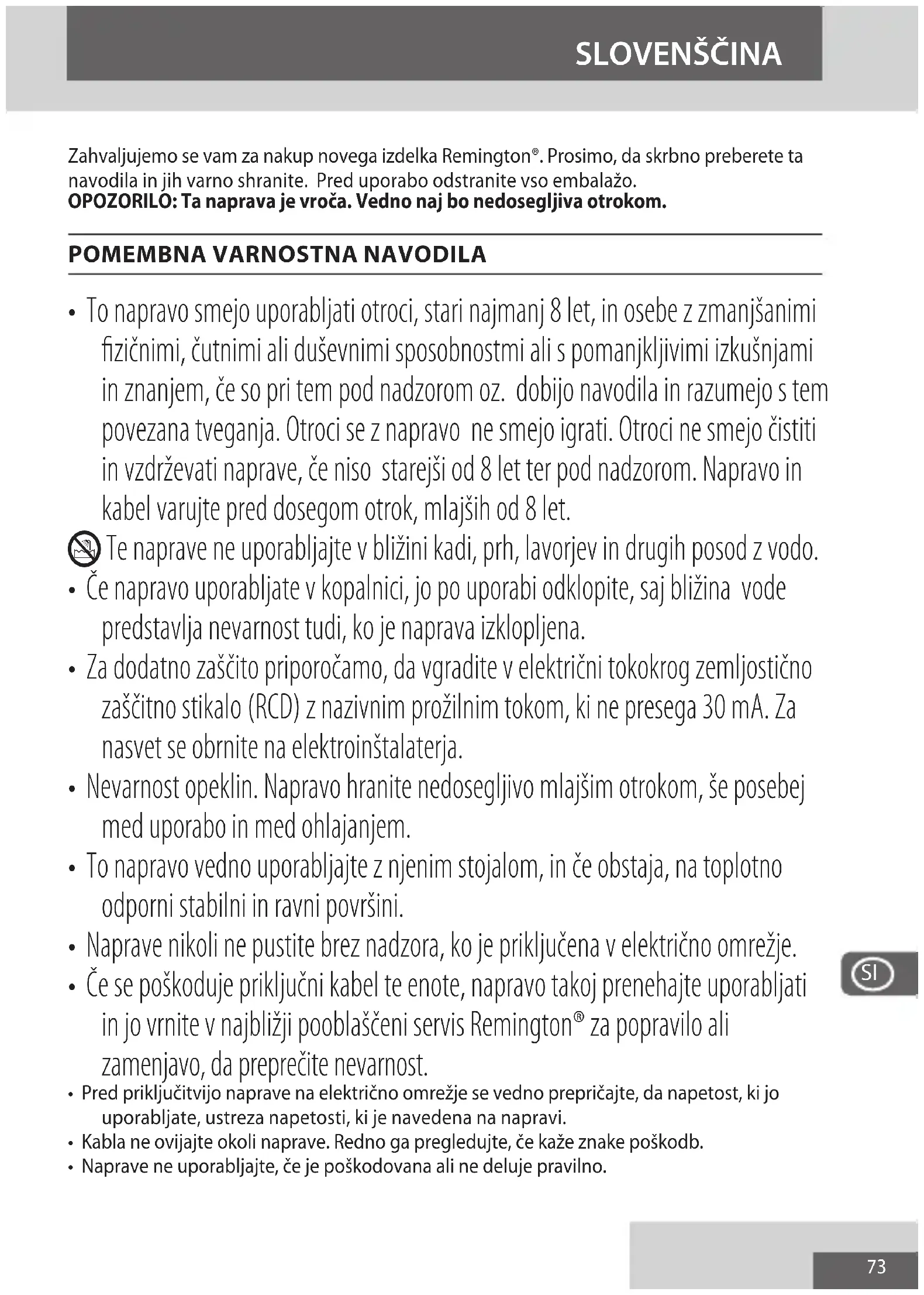 - Če se poškoduje priključni kabel te enote, napravo takoj prenehajte uporabljati in jo vrnite v najbližji pooblaščeni servis Remington® za popravilo ali zamenjavo, da preprečite nevarnost.