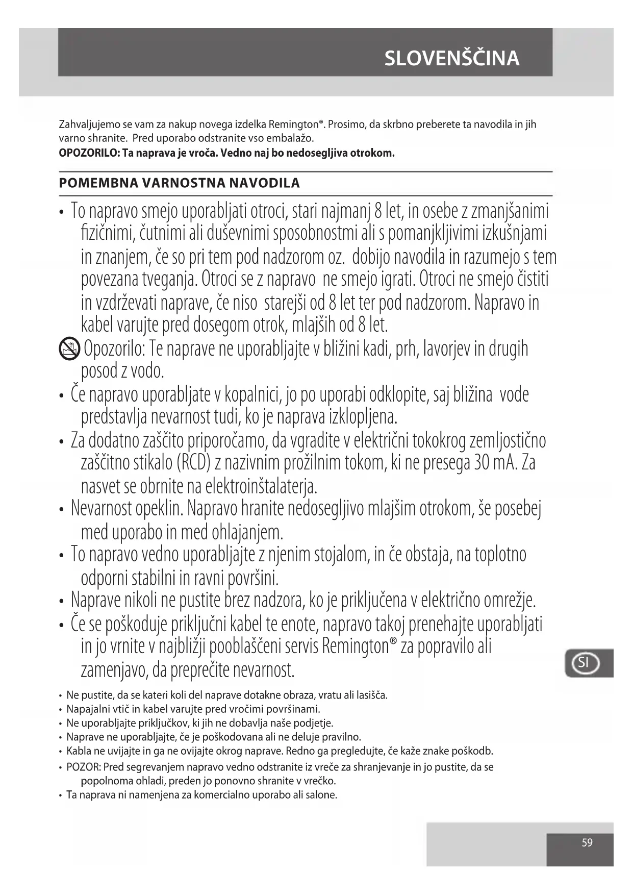 - Če se poškoduje priključni kabel te enote, napravo takoj prenehajte uporabljati in jo vrnite v najbližji pooblaščeni servis Remington® za popravilo ali zamenjavo, da preprečite nevarnost.