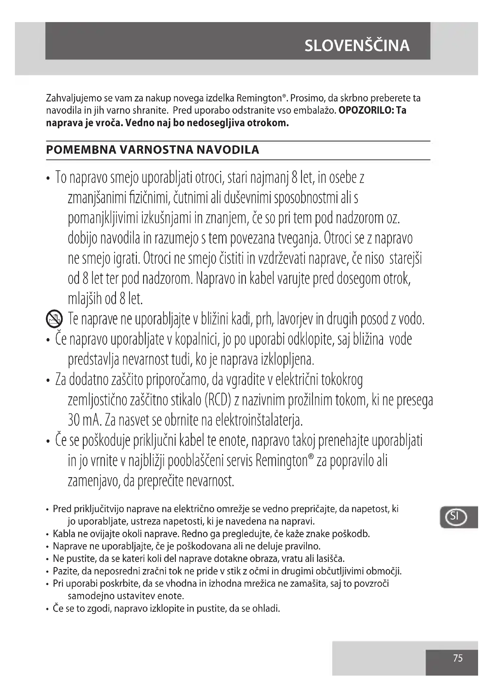 - Če se poškoduje priključni kabel te enote, napravo takoj prenehajte uporabljati in jo vrnite v najbližji pooblaščeni servis Remington® za popravilo ali zamenjavo, da preprečite nevarnost.