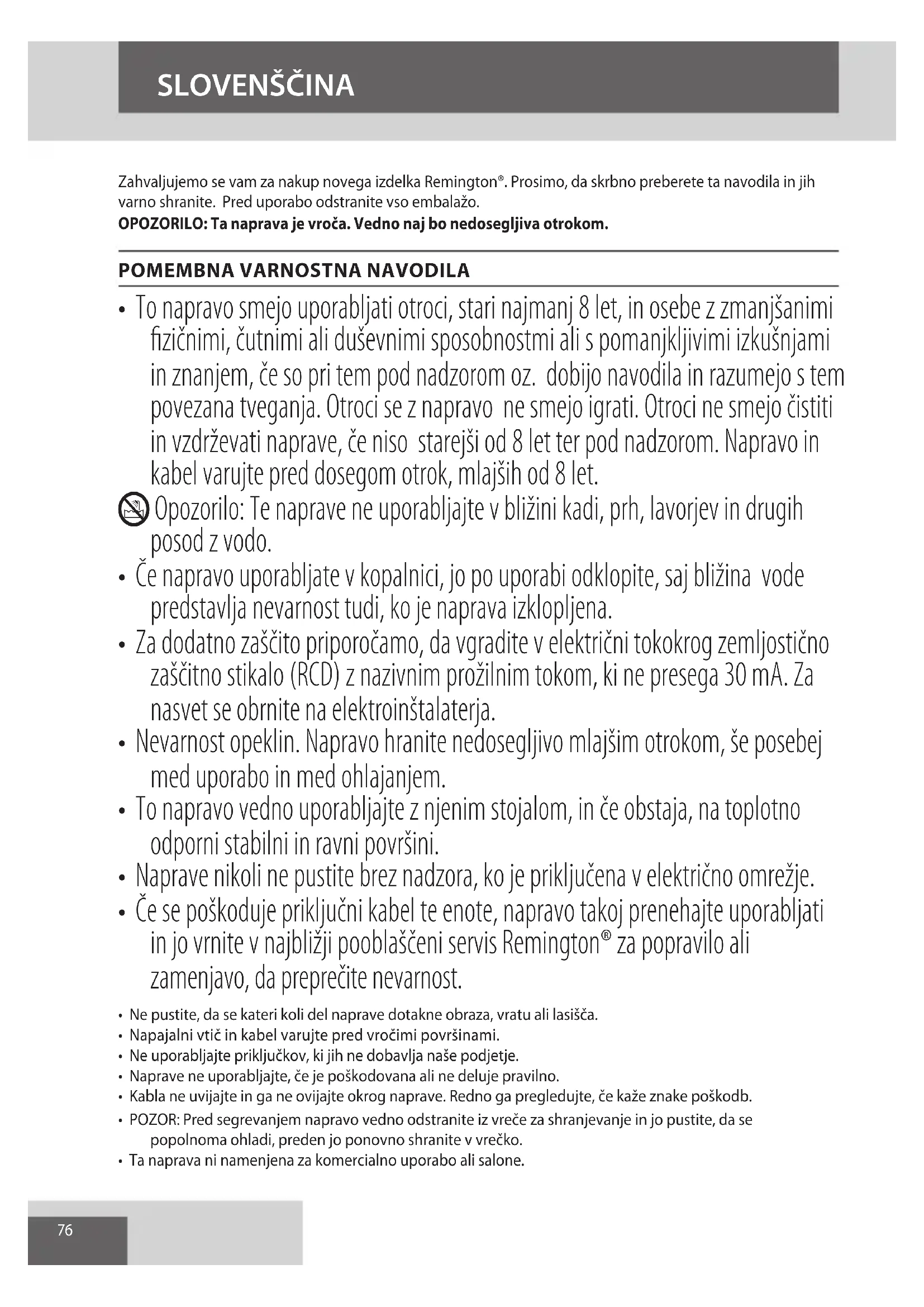 - Če se poškoduje priključni kabel te enote, napravo takoj prenehajte uporabljati in jo vrnite v najbližji pooblaščeni servis Remington® za popravilo ali zamenjavo, da preprečite nevarnost.