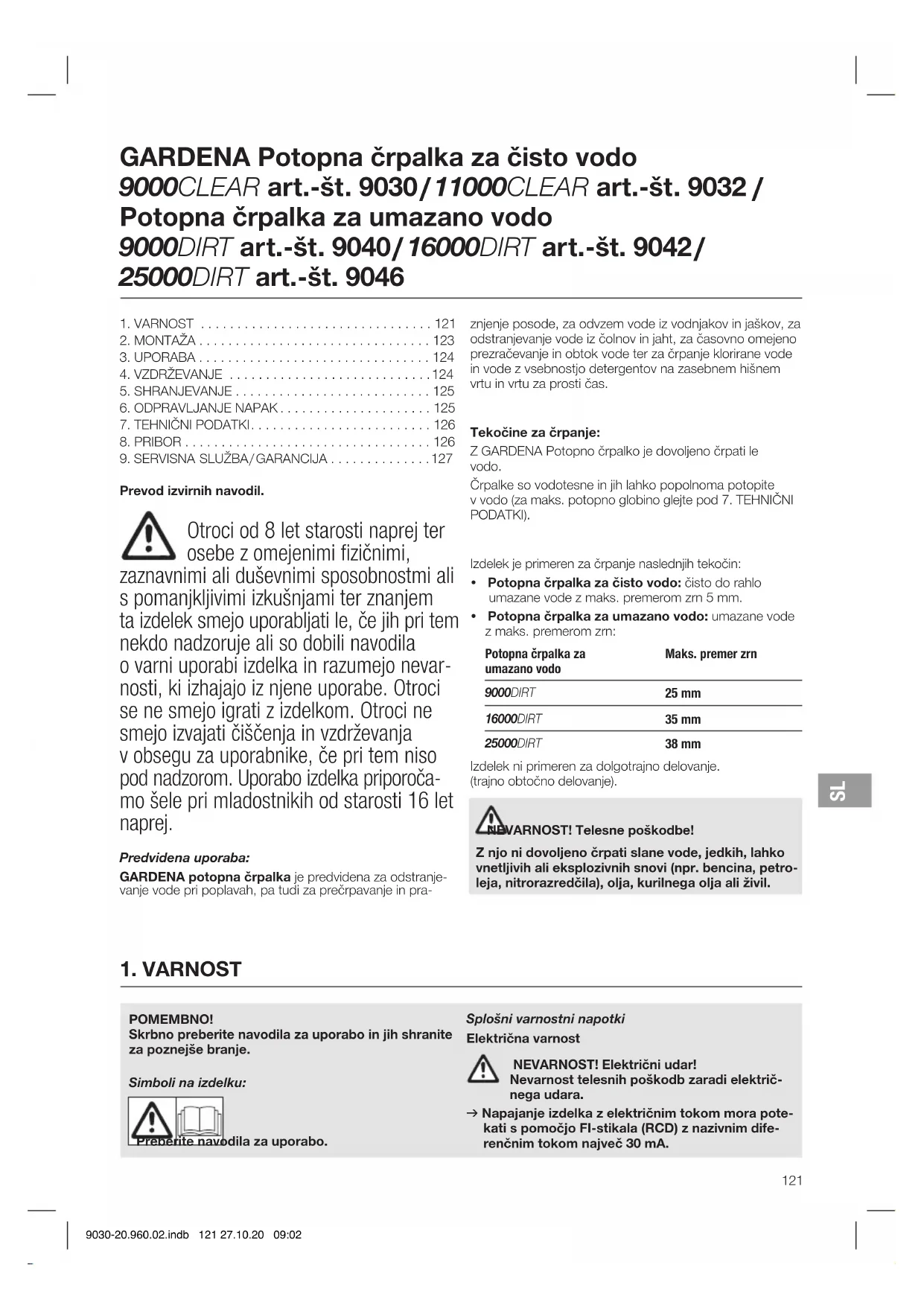 POMEMBNO! Skrbno preberite navodila za uporabo in jih shranite za poznejše branje. Simboli na izdelku: Preberite navodila za uporabo. Splošni varnostni napotki Električna varnost NEVARNOST! Električni udar! Nevarnost telesnih poškodb zaradi električ- nega udara. v Napajanje izdelka z električnim tokom mora pote- kati s pomočjo FI-stikala (RCD) z nazivnim dife- renčnim tokom največ 30 mA. GARDENA Potopna črpalka za čisto vodo 9000CLEAR art.-št. 9030 / 11000CLEAR art.-št. 9032 / Potopna črpalka za umazano vodo 9000DIRT art.-št. 9040 / 16000DIRT art.-št. 9042 / 25000DIRT art.-št. 9046
