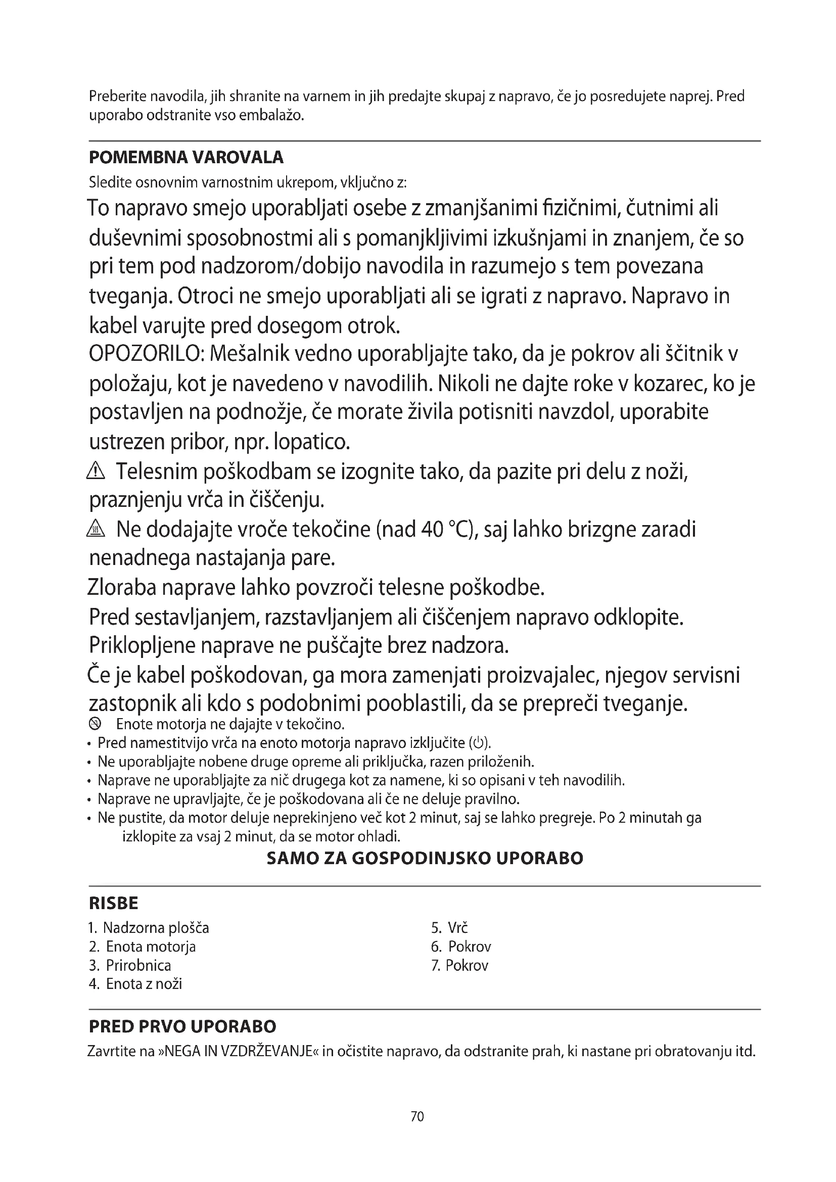 AE70 Preberite navodila, jih shranite na varnem in jih predajte skupaj z napravo, če jo posredujete naprej. Pred uporabo odstranite vso embalažo. POMEMBNA VAROVALA Sledite osnovnim varnostnim ukrepom, vključno z: To napravo smejo uporabljati osebe z zmanjšanimi zičnimi, čutnimi ali duševnimi sposobnostmi ali s pomanjkljivimi izkušnjami in znanjem, če so pri tem pod nadzorom/dobijo navodila in razumejo s tem povezana tveganja. Otroci ne smejo uporabljati ali se igrati z napravo. Napravo in kabel varujte pred dosegom otrok. OPOZORILO: Mešalnik vedno uporabljajte tako, da je pokrov ali ščitnik v položaju, kot je navedeno v navodilih. Nikoli ne dajte roke v kozarec, ko je postavljen na podnožje, če morate živila potisniti navzdol, uporabite ustrezen pribor, npr. lopatico. c Telesnim poškodbam se izognite tako, da pazite pri delu z noži, praznjenju vrča in čiščenju. h Ne dodajajte vroče tekočine (nad 40 °C), saj lahko brizgne zaradi nenadnega nastajanja pare. Zloraba naprave lahko povzroči telesne poškodbe. Pred sestavljanjem, razstavljanjem ali čiščenjem napravo odklopite. Priklopljene naprave ne puščajte brez nadzora. Če je kabel poškodovan, ga mora zamenjati proizvajalec, njegov servisni zastopnik ali kdo s podobnimi pooblastili, da se prepreči tveganje. l Enote motorja ne dajajte v tekočino.