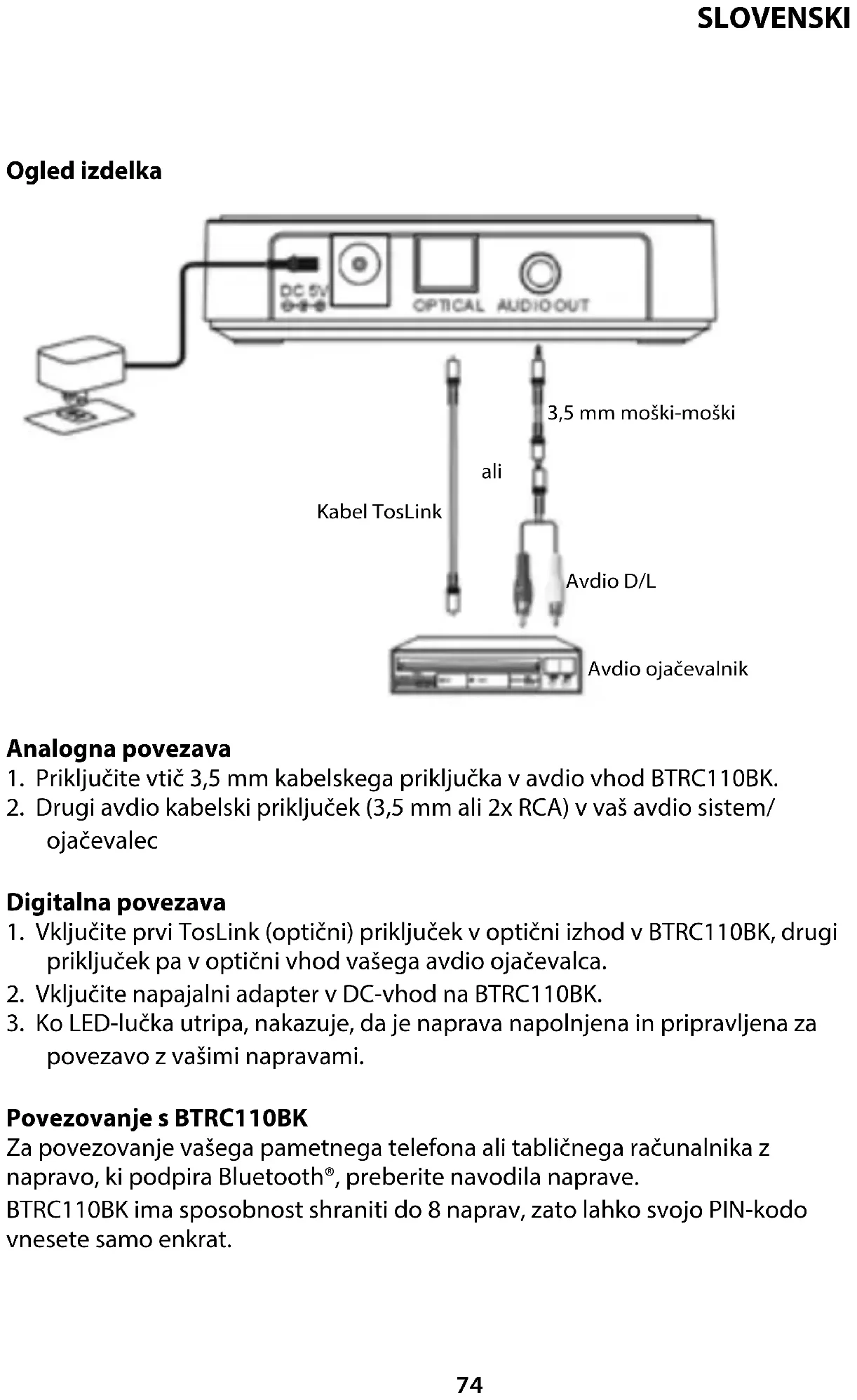 BTRC110BK«. LED-indikacija Indikacija Pomen Opis Zasveti vsakih 5sekund Povezovanje Iskanje naprave v načinu za povezovanje/čakanje na vzpostavitev povezave Neprestano vključeno Povezano BTRC110BK in naprava sta povezani Odpravljanje napak Če iz zvočnikov ne zaslišite nobenega zvoka, preverite naslednje: - prepričajte se, da se BTRC110BK napaja; - prepričajte se, da je avdio kabel pravilno vključen v BTRC110BK; - prepričajte se, da izvor zvoka na vašem ojačevalniku pravilno deluje; - prepričajte se, da je glasnost pravilno nastavljena; - prepričajte se, da so naprave največ 10metrov oddaljene od avdio oddajnika; - prepričajte se, da je na vaši napravi aktivirana funkcija Bluetooth®; - prepričajte se, da vaša naprava res predvaja glasbo.SLOVENSKI