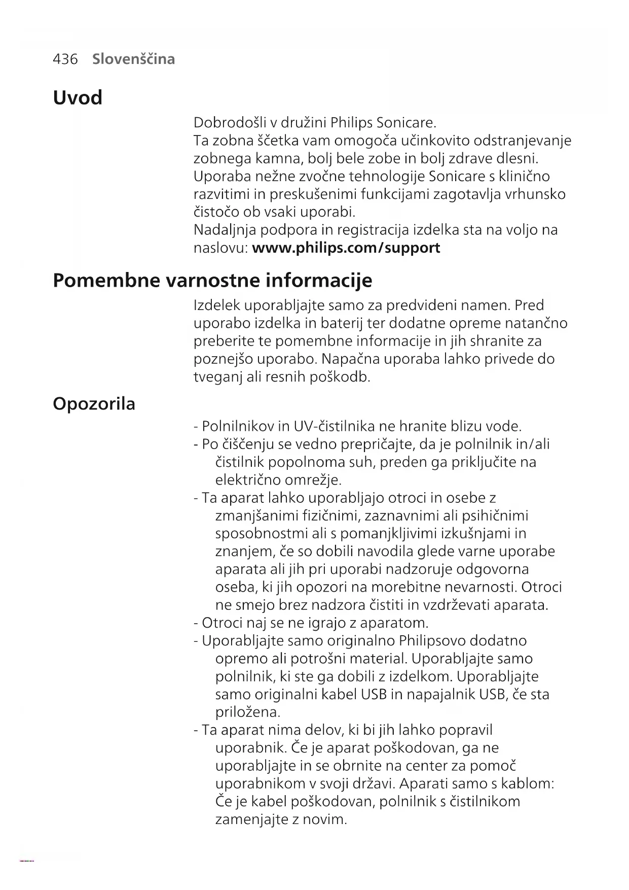 Slovenščina Uvod Dobrodošli v družini Philips Sonicare. Ta zobna ščetka vam omogoča učinkovito odstranjevanje zobnega kamna, bolj bele zobe in bolj zdrave dlesni. Uporaba nežne zvočne tehnologije Sonicare s klinično razvitimi in preskušenimi funkcijami zagotavlja vrhunsko čistočo ob vsaki uporabi. Nadaljnja podpora in registracija izdelka sta na voljo na naslovu: www.philips.com/support Pomembne varnostne informacije Izdelek uporabljajte samo za predvideni namen. Pred uporabo izdelka in baterij ter dodatne opreme natančno preberite te pomembne informacije in jih shranite za poznejšo uporabo. Napačna uporaba lahko privede do tveganj ali resnih poškodb. Opozorila - Polnilnikov in UV-čistilnika ne hranite blizu vode. - Po čiščenju se vedno prepričajte, da je polnilnik in/ali čistilnik popolnoma suh, preden ga priključite na električno omrežje. - Ta aparat lahko uporabljajo otroci in osebe z zmanjšanimi fizičnimi, zaznavnimi ali psihičnimi sposobnostmi ali s pomanjkljivimi izkušnjami in znanjem, če so dobili navodila glede varne uporabe aparata ali jih pri uporabi nadzoruje odgovorna oseba, ki jih opozori na morebitne nevarnosti. Otroci ne smejo brez nadzora čistiti in vzdrževati aparata. - Otroci naj se ne igrajo z aparatom. - Uporabljajte samo originalno Philipsovo dodatno opremo ali potrošni material. Uporabljajte samo polnilnik, ki ste ga dobili z izdelkom. Uporabljajte samo originalni kabel USB in napajalnik USB, če sta priložena. - Ta aparat nima delov, ki bi jih lahko popravil uporabnik. Če je aparat poškodovan, ga ne uporabljajte in se obrnite na center za pomoč uporabnikom v svoji državi. Aparati samo s kablom: Če je kabel poškodovan, polnilnik s čistilnikom zamenjajte z novim.437 Slovenščina - Polnilnika in/ali čistilnika ne uporabljajte na prostem ali v bližini ogrevanih površin. - Nobenega dela izdelka ne pomivajte v pomivalnem stroju. - Ta aparat je namenjen samo čiščenju zob, dlesni in jezika. - Čistilnik vedno hranite zunaj dosega otrok. - Čistilnik prenehajte uporabljati, če UV-sijalka sveti, ko so vrata odprta. UV-svetloba lahko škoduje očem in koži. - Čistilnik uporabljajte samo z nameščenim ščitnikom. - UV-sijalke UV-čistilnika se ne dotikajte, dokler je vroča. - Ne uporabljajte glave ščetke, ki ima zmečkane ali upognjene ščetine. Glavo ščetke zamenjajte vsake tri mesece ali prej, če je izrabljena. - Izogibajte se neposrednemu stiku z izdelki, ki vsebujejo eterična olja ali kokosovo olje. Stik s temi snovmi lahko povzroči, da ščetine ščetke odpadejo. - Če se po uporabi pojavi čezmerna krvavitev, če se krvavitev še naprej pojavlja po enem tednu uporabe ali če občutite nelagodje ali bolečino, nehajte uporabljati aparat in se posvetujte z zobozdravnikom ali zdravnikom. - Če ste v preteklih dveh mesecih prestali operacijo v ustih ali na dlesnih, se pred uporabo tega aparata posvetujte z zobozdravnikom. - Če imate srčni spodbujevalnik ali morebitni drug vsadek, se pred začetkom uporabe aparata obrnite na zdravnika ali proizvajalca vsadka. - Če imate medicinske zadržke, se pred uporabo aparata posvetujte z zdravnikom. - Aparat je namenjen osebni negi in ne za več bolnikov v zobozdravstveni ordinaciji ali ustanovi. Varnostna navodila glede baterij - V tem aparatu so baterije, ki jih smejo zamenjati samo usposobljene osebe.438 Slovenščina - Izdelek uporabljajte samo za predvideni namen. Pred uporabo izdelka in baterij ter dodatne opreme natančno preberite te informacije in jih shranite za poznejšo uporabo. Napačna uporaba lahko privede do tveganj ali resnih poškodb. Priložena dodatna oprema se lahko razlikuje glede na izdelek. - Uporabljajte samo originalno Philipsovo dodatno opremo in potrošni material. Uporabljajte samo odstranljivi napajalnik TCBxxxx, HX6100, HX6110, HX6160 ali WAAxxxx. - Izdelka in baterij ne približujte ognju in jih ne izpostavljajte neposredni sončni svetlobi ali visokim temperaturam. - Če se izdelek nenavadno močno segreje, ima močan vonj ali spremeni barvo oziroma če polnjenje traja dlje kot običajno, ga nehajte uporabljati in polniti ter se obrnite na družbo Philips. - Izdelkov in baterij ne dajajte v mikrovalovno pečico ali na indukcijska kuhališča. - Izdelka ali baterije ne odpirajte, spreminjajte, prebadajte, poškodujte ali razstavljajte, da se baterije ne bi pregrele ali začele sproščati strupenih ali nevarnih snovi. Pazite, da na baterijah ne pride do kratkega stika in jih ne polnite čezmerno ali obratno. - V tem aparatu so baterije, ki jih ni mogoče zamenjati. Ko bateriji poteče življenjska doba, je treba aparat ustrezno zavreči; glejte poglavje o recikliranju. - Če so baterije poškodovane ali puščajo, pazite, da ne pridejo v stik z očmi ali kožo. Če se to zgodi, prizadeto mesto nemudoma izperite z veliko vode in poiščite zdravniško pomoč. - Ko ravnate z baterijami, pazite, da bodo vaše roke, izdelek in baterije suhi. - Pazite, da priključne sponke baterij ne pridejo v stik s kovinskimi predmeti (npr. kovanci, sponkami za lase, prstani), da ne pride do nenamernega kratkega stika. Baterij ne zavijajte v aluminijasto folijo. Preden baterijo zavržete, zlepite njene kontakte ali jo dajte v plastično vrečko. - Izdelek polnite in uporabljajte pri temperaturi med 0 in 40 °C.439 Slovenščina Pogoji shranjevanja in prenašanja Temperatura: od –10do60 °C Elektromagnetna polja (EMF) Ta aparat Philips ustreza vsem upoštevnim standardom in predpisom glede izpostavljenosti elektromagnetnim poljem. Direktiva o radijski opremi Philips s tem izjavlja, da so električne zobne ščetke z radijsko opremo (Bluetooth, NFC) skladne z Direktivo 2014/53/EU. - Radiofrekvenčni vmesnik Bluetooth v izdelkih, opremljenih z njim, deluje pri frekvenci 2,4 GHz. - Največja izhodna moč, ki jo oddaja aparat z vmesnikom Bluetooth, je 3 dBm. - Radiofrekvenčni vmesnik NFC v izdelkih, opremljenih z njim, deluje pri frekvenci 13,56 MHz. - Najve