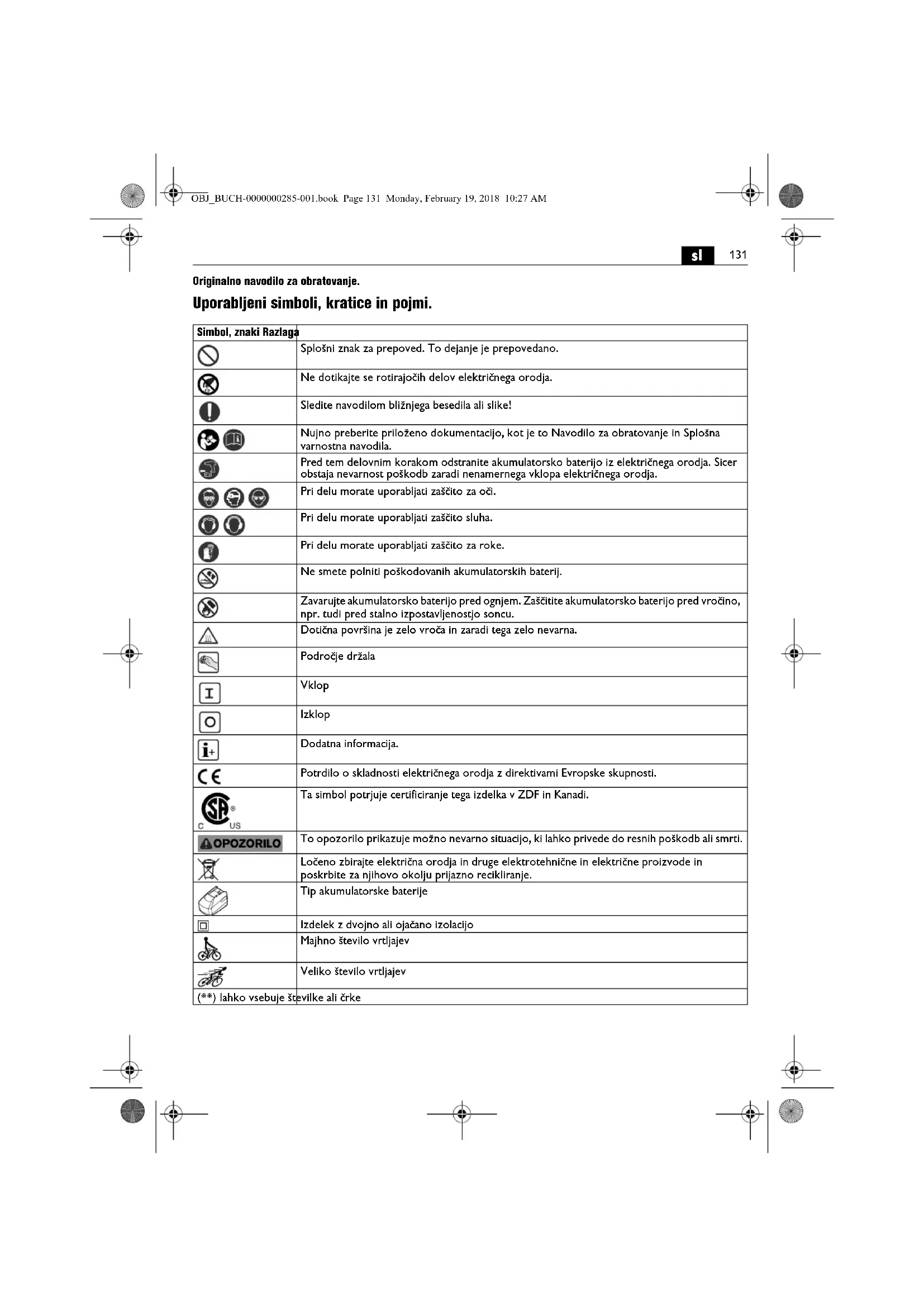 Originalno navodilo za obratovanje. Uporabljeni simboli, kratice in pojmi. Simbol, znaki Razlaga Splošni znak za prepoved. To dejanje je prepovedano. Ne dotikajte se rotirajočih delov električnega orodja. Sledite navodilom bližnjega besedila ali slike! Nujno preberite priloženo dokumentacijo, kot je to Navodilo za obratovanje in Splošna varnostna navodila. Pred tem delovnim korakom odstranite akumulatorsko baterijo iz električnega orodja. Sicer obstaja nevarnost poškodb zaradi nenamernega vklopa električnega orodja. Pri delu morate uporabljati zaščito za oči. Pri delu morate uporabljati zaščito sluha. Pri delu morate uporabljati zaščito za roke. Ne smete polniti poškodovanih akumulatorskih baterij. Zavarujte akumulatorsko baterijo pred ognjem. Zaščitite akumulatorsko baterijo pred vročino, npr. tudi pred stalno izpostavljenostjo soncu. Dotična površina je zelo vroča in zaradi tega zelo nevarna. Področje držala Vklop Izklop Dodatna informacija. Potrdilo o skladnosti električnega orodja z direktivami Evropske skupnosti. Ta simbol potrjuje certificiranje tega izdelka v ZDF in Kanadi. To opozorilo prikazuje možno nevarno situacijo, ki lahko privede do resnih poškodb ali smrti. Ločeno zbirajte električna orodja in druge elektrotehnične in električne proizvode in poskrbite za njihovo okolju prijazno recikliranje. Tip akumulatorske baterije Izdelek z dvojno ali ojačano izolacijo Majhno število vrtljajev Veliko število vrtljajev (**) lahko vsebuje številke ali črke OBJ_BUCH-0000000285-001.book Page 131 Monday, February 19, 2018 10:27 AM132