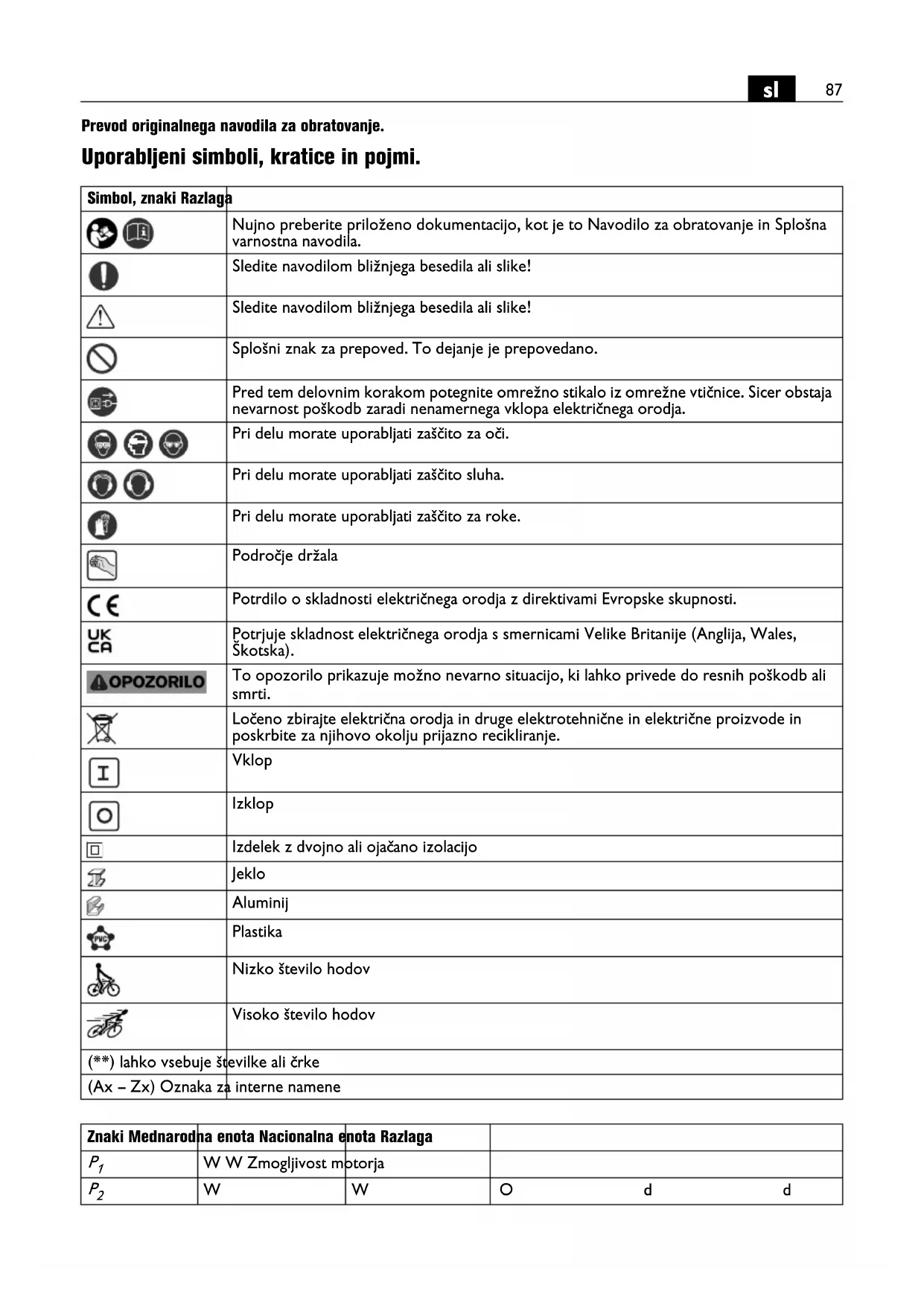 Prevod originalnega navodila za obratovanje. Uporabljeni simboli, kratice in pojmi. Simbol, znaki Razlaga Nujno preberite priloženo dokumentacijo, kot je to Navodilo za obratovanje in Splošna varnostna navodila. Sledite navodilom bližnjega besedila ali slike! Sledite navodilom bližnjega besedila ali slike! Splošni znak za prepoved. To dejanje je prepovedano. Pred tem delovnim korakom potegnite omrežno stikalo iz omrežne vtičnice. Sicer obstaja nevarnost poškodb zaradi nenamernega vklopa električnega orodja. Pri delu morate uporabljati zaščito za oči. Pri delu morate uporabljati zaščito sluha. Pri delu morate uporabljati zaščito za roke. Področje držala Potrdilo o skladnosti električnega orodja z direktivami Evropske skupnosti. Potrjuje skladnost električnega orodja s smernicami Velike Britanije (Anglija, Wales, Škotska). To opozorilo prikazuje možno nevarno situacijo, ki lahko privede do resnih poškodb ali smrti. Ločeno zbirajte električna orodja in druge elektrotehnične in električne proizvode in poskrbite za njihovo okolju prijazno recikliranje. Vklop Izklop Izdelek z dvojno ali ojačano izolacijo Jeklo Aluminij Plastika Nizko število hodov Visoko število hodov (**) lahko vsebuje številke ali črke (Ax – Zx) Oznaka za interne namene Znaki Mednarodna enota Nacionalna enota Razlaga