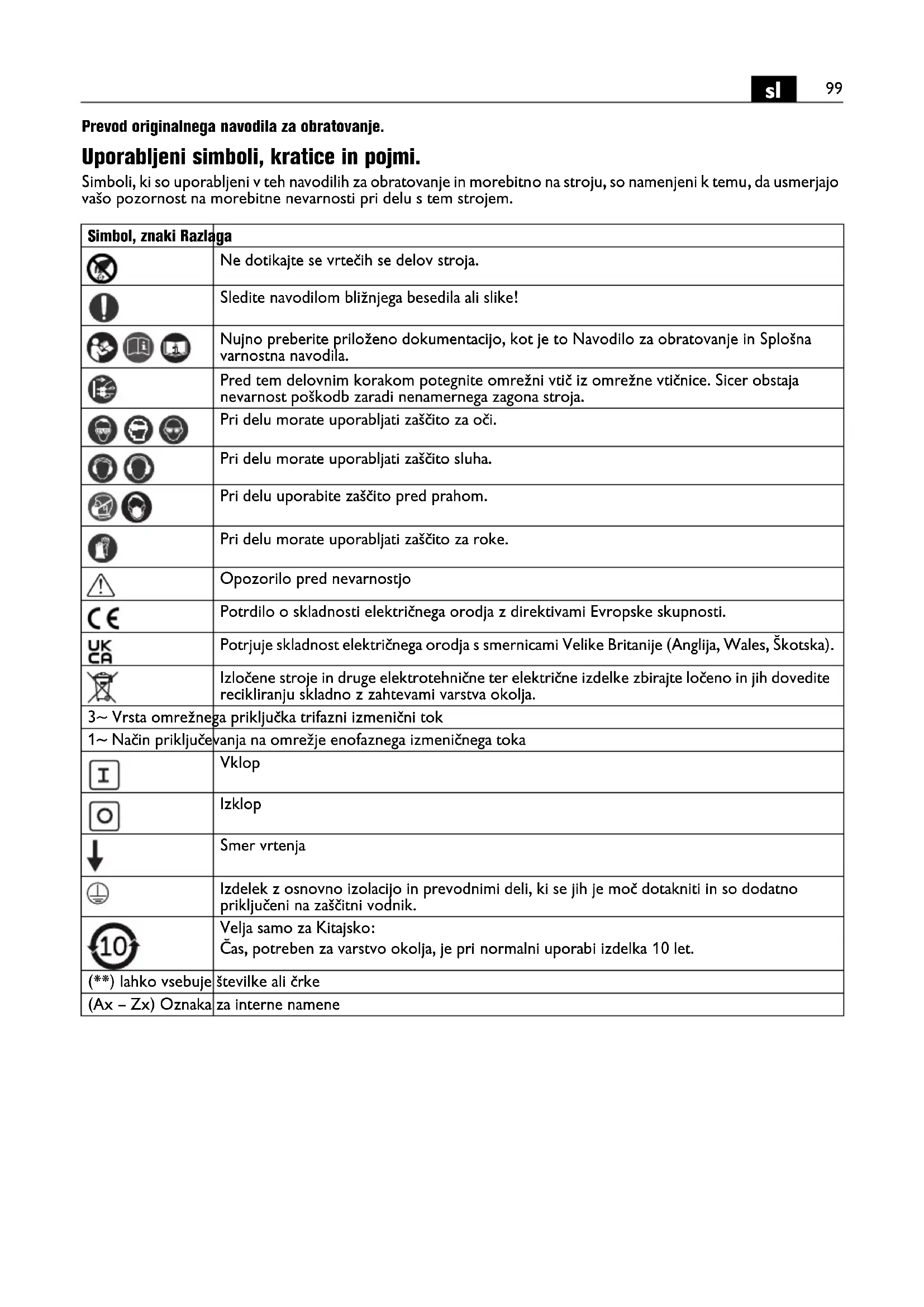 Prevod originalnega navodila za obratovanje. Uporabljeni simboli, kratice in pojmi. Simboli, ki so uporabljeni v teh navodilih za obratovanje in morebitno na stroju, so namenjeni k temu, da usmerjajo vašo pozornost na morebitne nevarnosti pri delu s tem strojem. Simbol, znaki Razlaga Ne dotikajte se vrtečih se delov stroja. Sledite navodilom bližnjega besedila ali slike! Nujno preberite priloženo dokumentacijo, kot je to Navodilo za obratovanje in Splošna varnostna navodila. Pred tem delovnim korakom potegnite omrežni vtič iz omrežne vtičnice. Sicer obstaja nevarnost poškodb zaradi nenamernega zagona stroja. Pri delu morate uporabljati zaščito za oči. Pri delu morate uporabljati zaščito sluha. Pri delu uporabite zaščito pred prahom. Pri delu morate uporabljati zaščito za roke. Opozorilo pred nevarnostjo Potrdilo o skladnosti električnega orodja z direktivami Evropske skupnosti. Potrjuje skladnost električnega orodja s smernicami Velike Britanije (Anglija, Wales, Škotska). Izločene stroje in druge elektrotehnične ter električne izdelke zbirajte ločeno in jih dovedite recikliranju skladno z zahtevami varstva okolja. 3~ Vrsta omrežnega priključka trifazni izmenični tok 1~ Način priključevanja na omrežje enofaznega izmeničnega toka Vklop Izklop Smer vrtenja Izdelek z osnovno izolacijo in prevodnimi deli, ki se jih je moč dotakniti in so dodatno priključeni na zaščitni vodnik. Velja samo za Kitajsko: Čas, potreben za varstvo okolja, je pri normalni uporabi izdelka 10 let. (**) lahko vsebuje številke ali črke (Ax – Zx) Oznaka za interne namene100