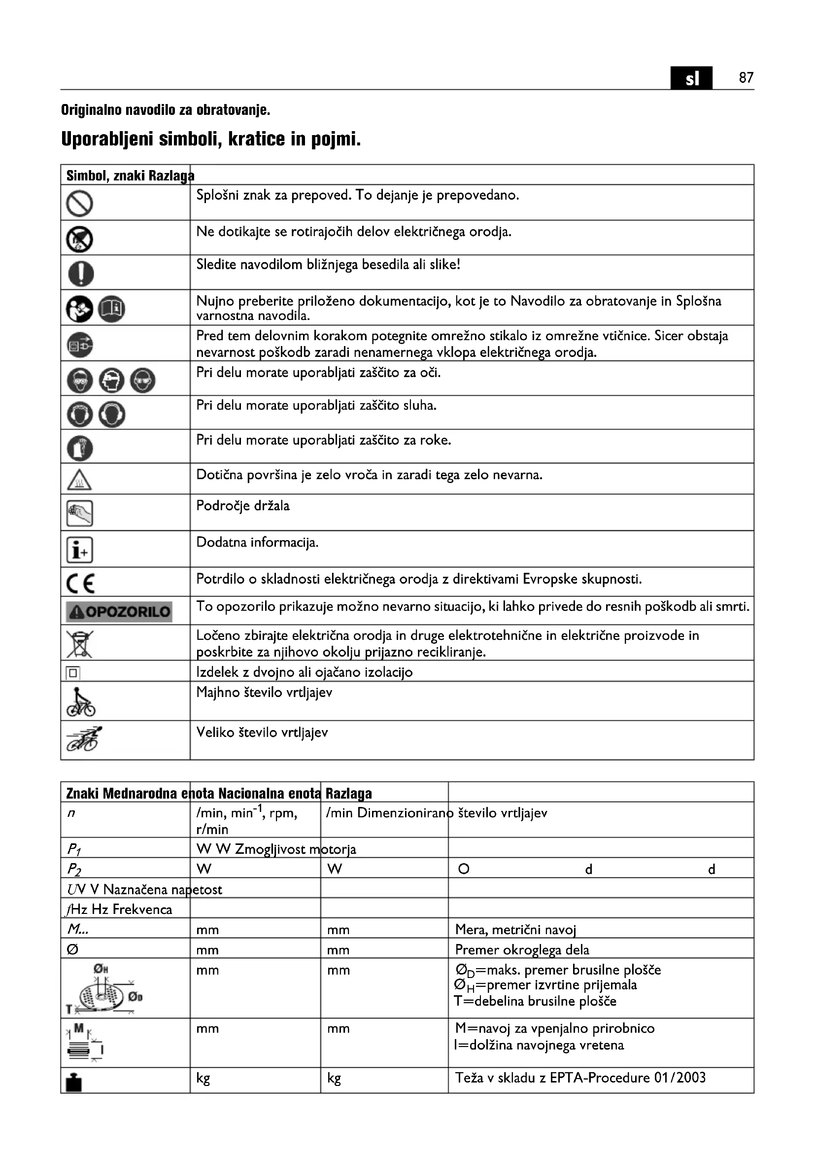 Originalno navodilo za obratovanje. Uporabljeni simboli, kratice in pojmi. Simbol, znaki Razlaga Splošni znak za prepoved. To dejanje je prepovedano. Ne dotikajte se rotirajočih delov električnega orodja. Sledite navodilom bližnjega besedila ali slike! Nujno preberite priloženo dokumentacijo, kot je to Navodilo za obratovanje in Splošna varnostna navodila. Pred tem delovnim korakom potegnite omrežno stikalo iz omrežne vtičnice. Sicer obstaja nevarnost poškodb zaradi nenamernega vklopa električnega orodja. Pri delu morate uporabljati zaščito za oči. Pri delu morate uporabljati zaščito sluha. Pri delu morate uporabljati zaščito za roke. Dotična površina je zelo vroča in zaradi tega zelo nevarna. Področje držala Dodatna informacija. Potrdilo o skladnosti električnega orodja z direktivami Evropske skupnosti. To opozorilo prikazuje možno nevarno situacijo, ki lahko privede do resnih poškodb ali smrti. Ločeno zbirajte električna orodja in druge elektrotehnične in električne proizvode in poskrbite za njihovo okolju prijazno recikliranje. Izdelek z dvojno ali ojačano izolacijo Majhno število vrtljajev Veliko število vrtljajev Znaki Mednarodna enota Nacionalna enota Razlaga