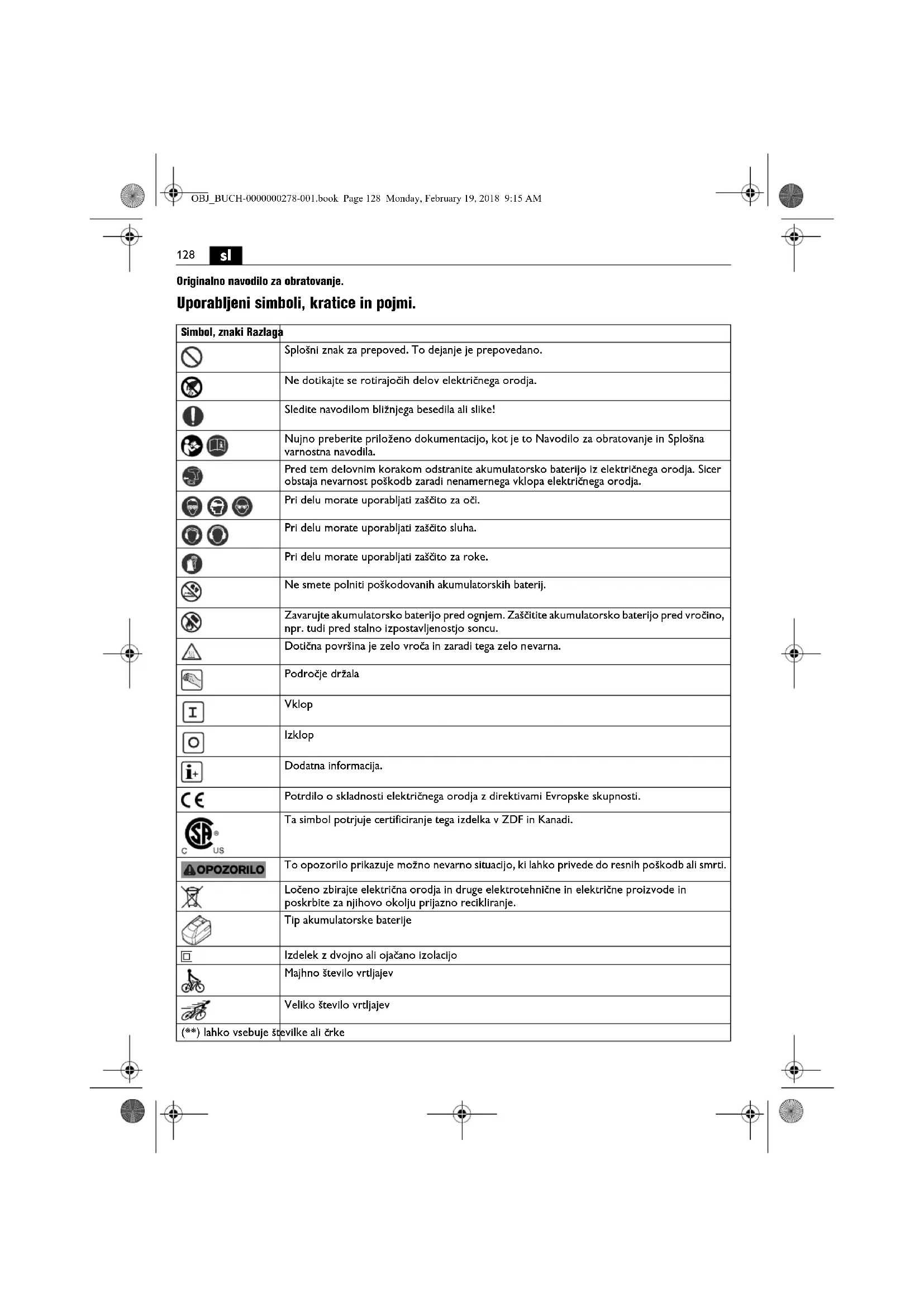 Originalno navodilo za obratovanje. Uporabljeni simboli, kratice in pojmi. Simbol, znaki Razlaga Splošni znak za prepoved. To dejanje je prepovedano. Ne dotikajte se rotirajočih delov električnega orodja. Sledite navodilom bližnjega besedila ali slike! Nujno preberite priloženo dokumentacijo, kot je to Navodilo za obratovanje in Splošna varnostna navodila. Pred tem delovnim korakom odstranite akumulatorsko baterijo iz električnega orodja. Sicer obstaja nevarnost poškodb zaradi nenamernega vklopa električnega orodja. Pri delu morate uporabljati zaščito za oči. Pri delu morate uporabljati zaščito sluha. Pri delu morate uporabljati zaščito za roke. Ne smete polniti poškodovanih akumulatorskih baterij. Zavarujte akumulatorsko baterijo pred ognjem. Zaščitite akumulatorsko baterijo pred vročino, npr. tudi pred stalno izpostavljenostjo soncu. Dotična površina je zelo vroča in zaradi tega zelo nevarna. Področje držala Vklop Izklop Dodatna informacija. Potrdilo o skladnosti električnega orodja z direktivami Evropske skupnosti. Ta simbol potrjuje certificiranje tega izdelka v ZDF in Kanadi. To opozorilo prikazuje možno nevarno situacijo, ki lahko privede do resnih poškodb ali smrti. Ločeno zbirajte električna orodja in druge elektrotehnične in električne proizvode in poskrbite za njihovo okolju prijazno recikliranje. Tip akumulatorske baterije Izdelek z dvojno ali ojačano izolacijo Majhno število vrtljajev Veliko število vrtljajev (**) lahko vsebuje številke ali črke OBJ_BUCH-0000000278-001.book Page 128 Monday, February 19, 2018 9:15 AM129