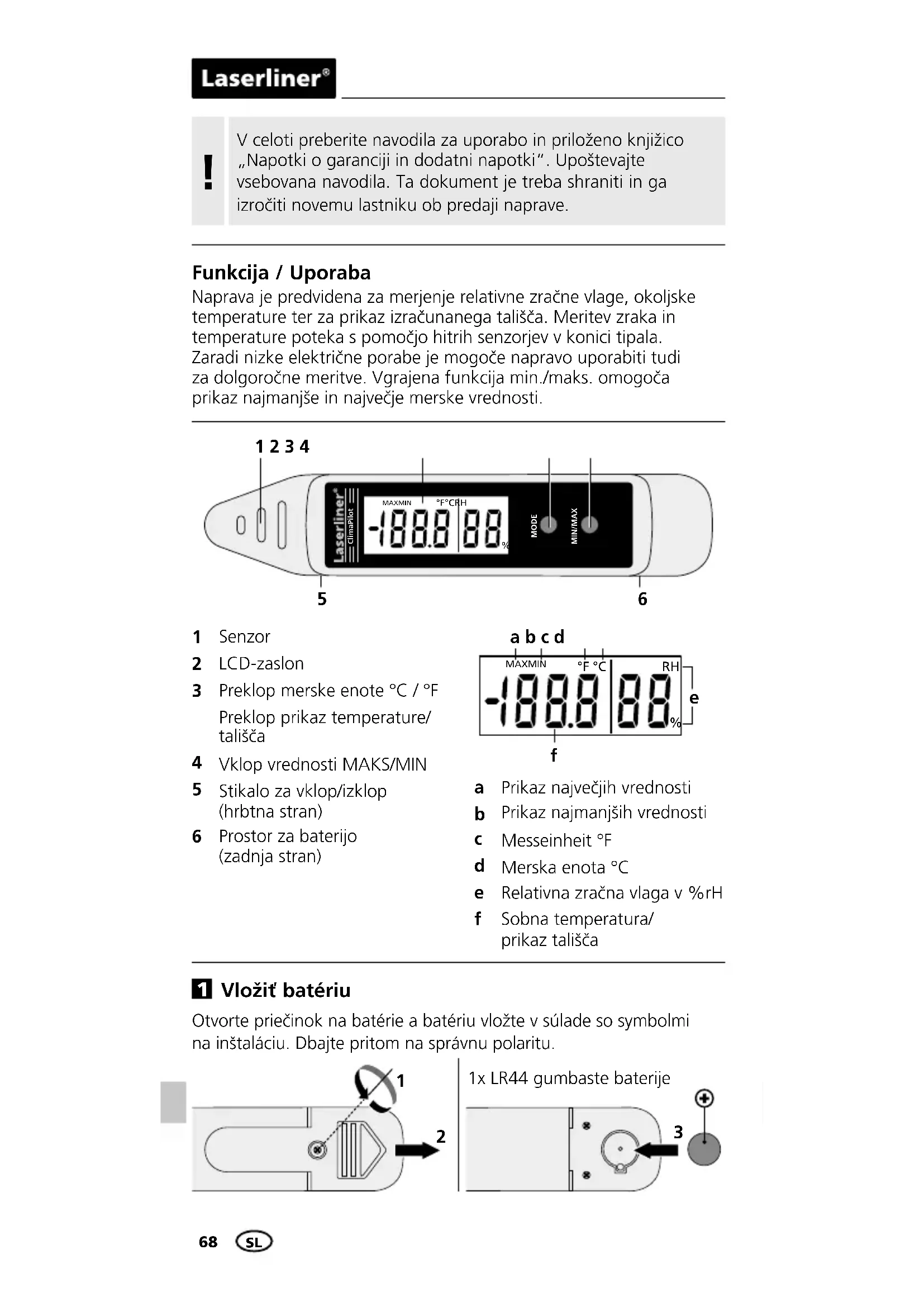 Funkcija / Uporaba Naprava je predvidena za merjenje relativne zračne vlage, okoljske temperature ter za prikaz izračunanega tališča. Meritev zraka in temperature poteka s pomočjo hitrih senzorjev v konici tipala. Zaradi nizke električne porabe je mogoče napravo uporabiti tudi za dolgoročne meritve. Vgrajena funkcija min./maks. omogoča prikaz najmanjše in največje merske vrednosti. Senzor LCD-zaslon Preklop merske enote °C / °F Preklop prikaz temperature/ tališča Vklop vrednosti MAKS/MIN Stikalo za vklop/izklop (hrbtna stran) Prostor za baterijo (zadnja stran) Prikaz največjih vrednosti Prikaz najmanjših vrednosti Messeinheit °F Merska enota °C Relativna zračna vlaga v %rH Sobna temperatura/ prikaz tališča