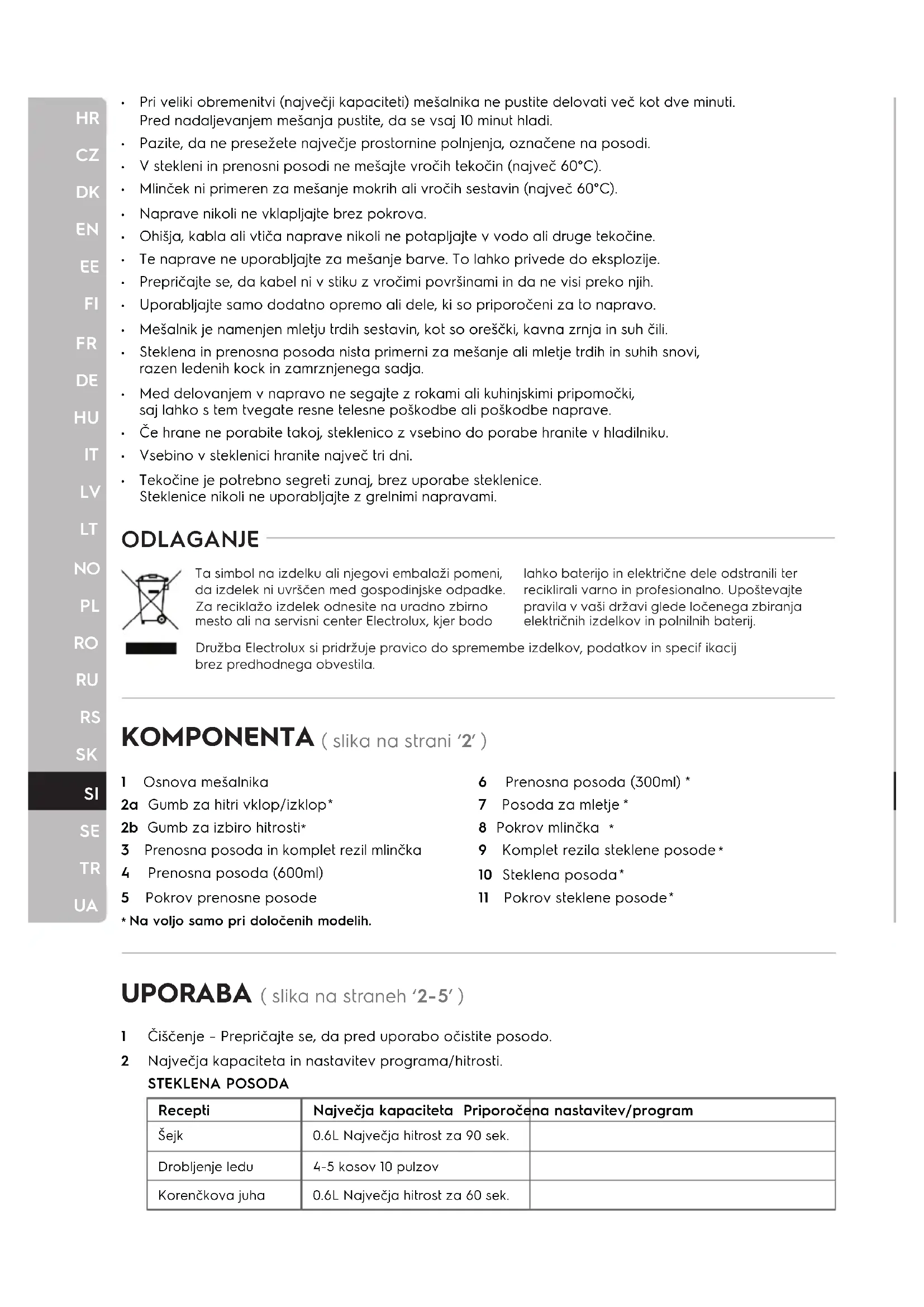 Pri veliki obremenitvi (največji kapaciteti) mešalnika ne pustite delovati več kot dve minuti. Pred nadaljevanjem mešanja pustite, da se vsaj 10 minut hladi. Pazite, da ne presežete največje prostornine polnjenja, označene na posodi. V stekleni in prenosni posodi ne mešajte vročih tekočin (največ 60°C). Mlinček ni primeren za mešanje mokrih ali vročih sestavin (največ 60°C). Naprave nikoli ne vklapljajte brez pokrova. Ohišja, kabla ali vtiča naprave nikoli ne potapljajte v vodo ali druge tekočine. Te naprave ne uporabljajte za mešanje barve. To lahko privede do eksplozije. Prepričajte se, da kabel ni v stiku z vročimi površinami in da ne visi preko njih. Uporabljajte samo dodatno opremo ali dele, ki so priporočeni za to napravo. Mešalnik je namenjen mletju trdih sestavin, kot so oreščki, kavna zrnja in suh čili. Steklena in prenosna posoda nista primerni za mešanje ali mletje trdih in suhih snovi, razen ledenih kock in zamrznjenega sadja. Med delovanjem v napravo ne segajte z rokami ali kuhinjskimi pripomočki, saj lahko s tem tvegate resne telesne poškodbe ali poškodbe naprave. Če hrane ne porabite takoj, steklenico z vsebino do porabe hranite v hladilniku. Vsebino v steklenici hranite največ tri dni. Tekočine je potrebno segreti zunaj, brez uporabe steklenice. Steklenice nikoli ne uporabljajte z grelnimi napravami. ODLAGANJE Družba Electrolux si pridržuje pravico do spremembe izdelkov, podatkov in specif ikacijbrez predhodnega obvestila.Ta simbol na izdelku ali njegovi embalaži pomeni, da izdelek ni uvrščen med gospodinjske odpadke. Za reciklažo izdelek odnesite na uradno zbirno mesto ali na servisni center Electrolux, kjer bodo lahko baterijo in električne dele odstranili ter reciklirali varno in profesionalno. Upoštevajte pravila v vaši državi glede ločenega zbiranja električnih izdelkov in polnilnih baterij.