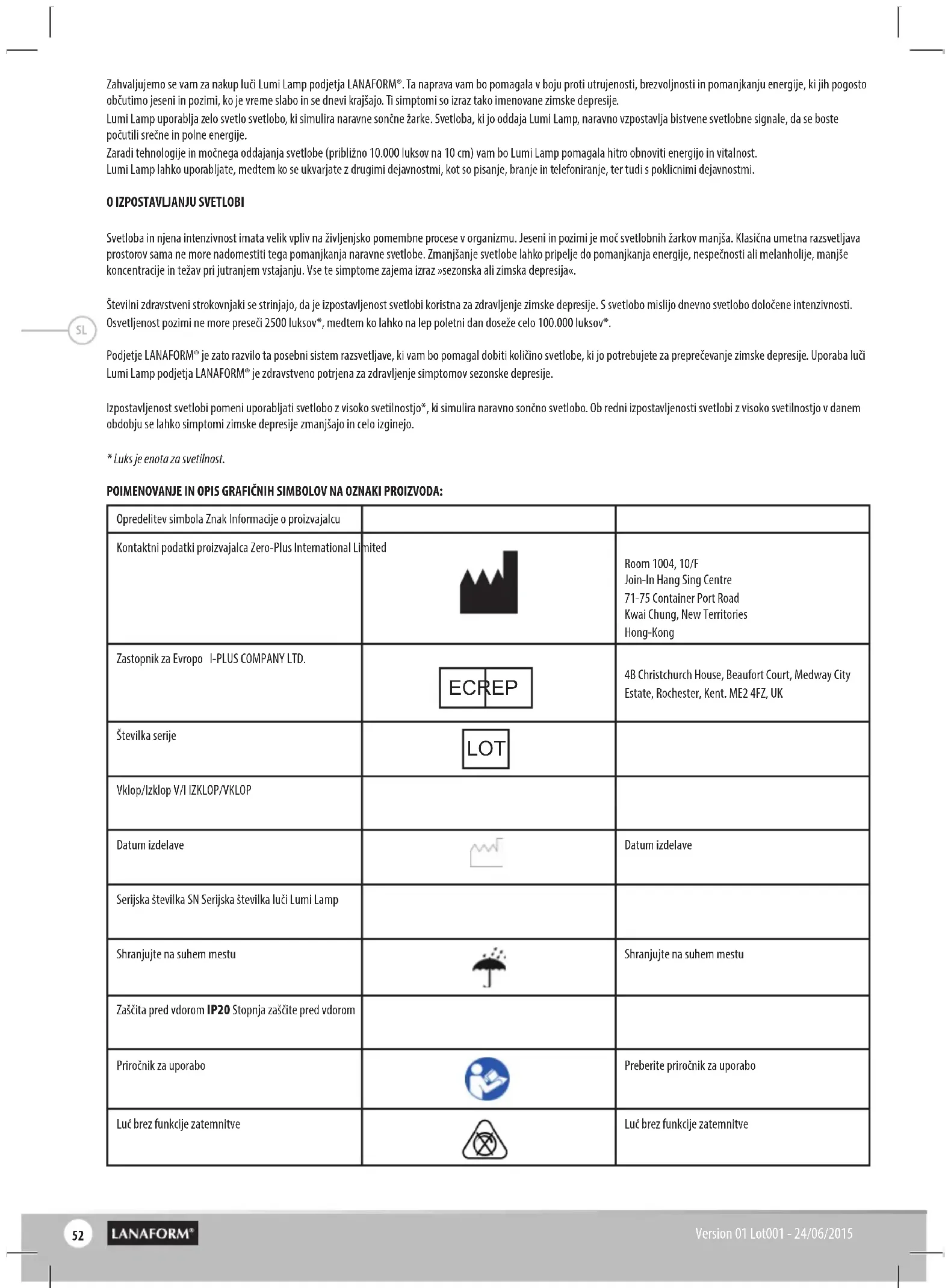 - Luks je enota za svetilnost. POIMENOVANJE IN OPIS GRAFIČNIH SIMBOLOV NA OZNAKI PROIZVODA: Opredelitev simbola Znak Informacije o proizvajalcu Kontaktni podatki proizvajalca Zero-Plus International Limited Room 1004, 10/F Join-In Hang Sing Centre 71-75 Container Port Road Kwai Chung, New Territories Hong-Kong Zastopnik za Evropo I-PLUS COMPANY LTD. 4B Christchurch House, Beaufort Court, Medway City Estate, Rochester, Kent. ME2 4FZ, UK Številka serije Vklop/Izklop V/I IZKLOP/VKLOP Datum izdelave Datum izdelave Serijska številka SN Serijska številka luči Lumi Lamp Shranjujte na suhem mestu Shranjujte na suhem mestu Zaščita pred vdorom IP20 Stopnja zaščite pred vdorom Priročnik za uporabo Preberite priročnik za uporabo Luč brez funkcije zatemnitve Luč brez funkcije zatemnitve LOT EC REP SL53 Version 01 Lot001 - 24/06/2015 Pozor, glejte navodila za uporabo. Pozor, preberite priložene dokumente. Pred uporabo naprave preberite ta navodila za uporabo. Pri uporabi naprave prav tako pozorno upoštevajte ta navodila. Glejte navodila za uporabo. Preberite navodila za uporabo, priložena izdelku. Oprema razreda II Odpadna električna in elektronska oprema (OEEO) Simbol CE Simbol CE potrjuje, da je izdelek skladen z bistvenimi zahtevami Direktive Sveta 93/42/EGS o medicinskih pripomočkih. PRED UPORABO NAPRAVE DAY LIGHT PREBERITE VSA NAVODILA, ZLASTI GLAVNA VARNOSTNA OPOZORILA: