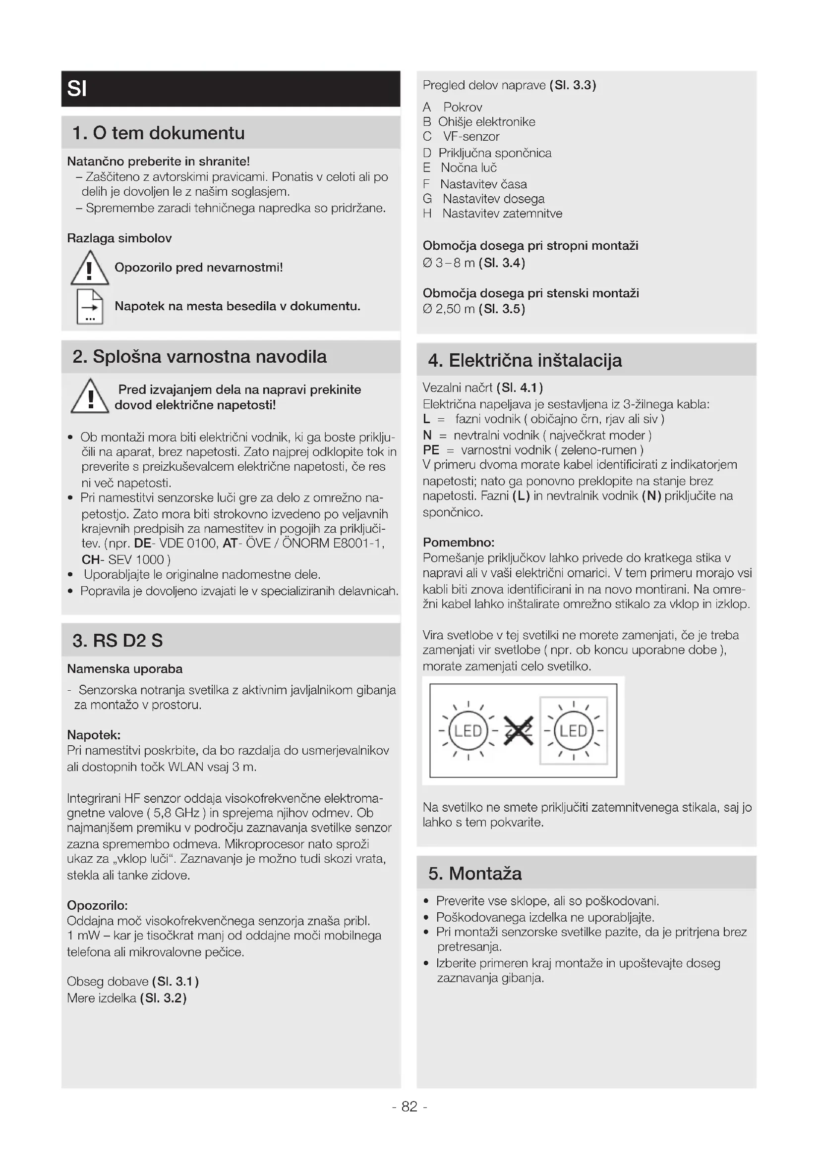 - Ob montaži mora biti električni vodnik, ki ga boste priklju-čili na aparat, brez napetosti. Zato najprej odklopite tok in preverite s preizkuševalcem električne napetosti, če res ni več napetosti. • Pri namestitvi senzorske luči gre za delo z omrežno na-petostjo. Zato mora biti strokovno izvedeno po veljavnih krajevnih predpisih za namestitev in pogojih za priključi- tev. ( npr. DE- VDE 0100, AT- ÖVE / ÖNORM E8001-1, CH- SEV 1000 )• Uporabljajte le originalne nadomestne dele.• Popravila je dovoljeno izvajati le v specializiranih delavnicah. 3 RS D2 S Namenska uporaba- Senzorska notranja svetilka z aktivnim javljalnikom gibanja za montažo v prostoru.Napotek:Pri namestitvi poskrbite, da bo razdalja do usmerjevalnikov ali dostopnih točk WLAN vsaj 3 m.Integrirani HF senzor oddaja visokofrekvenčne elektroma-gnetne valove ( 5,8 GHz ) in sprejema njihov odmev. Ob najmanjšem premiku v področju zaznavanja svetilke senzor zazna spremembo odmeva. Mikroprocesor nato sproži ukaz za „vklop luči“. Zaznavanje je možno tudi skozi vrata, stekla ali tanke zidove. Opozorilo: Oddajna moč visokofrekvenčnega senzorja znaša pribl. 1mW – kar je tisočkrat manj od oddajne moči mobilnega telefona ali mikrovalovne pečice.Obseg dobave ( Sl31 )Mere izdelka ( Sl32 ) !- 83 - Navodila za montažo