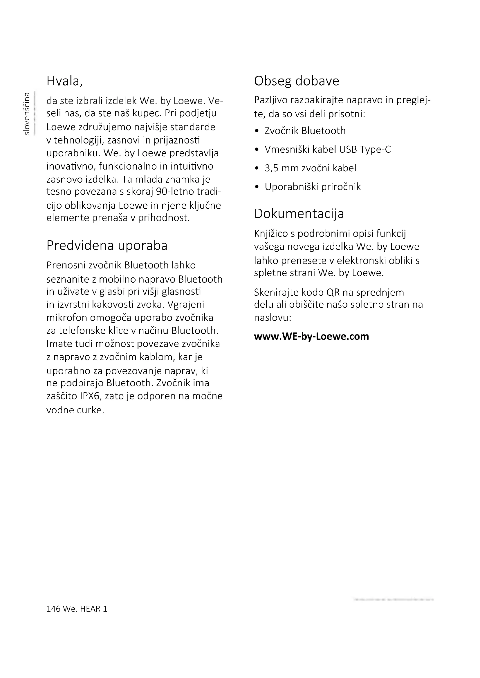 - Uporabniški priročnik Dokumentacija Knjižico s podrobnimi opisi funkcij vašega novega izdelka We. by Loewe lahko prenesete v elektronski obliki s spletne strani We. by Loewe. Skenirajte kodo QR na sprednjem delu ali obiščite našo spletno stran na naslovu: www.WE-by-Loewe.comWe. HEAR 1 147 slovenščina 1 Pomembna varnostna navodila Pozor: Pozorno preberite to stran, da zagotovite varno delovanje naprave. Razlaga simbolov Ta simbol označuje nevarnos zaradi visokih napetos. Ta simbol uporabnika opozarja na druge, bolj specične nevarnos. Ta simbol označuje nevarnos zaradi pojava ognja.