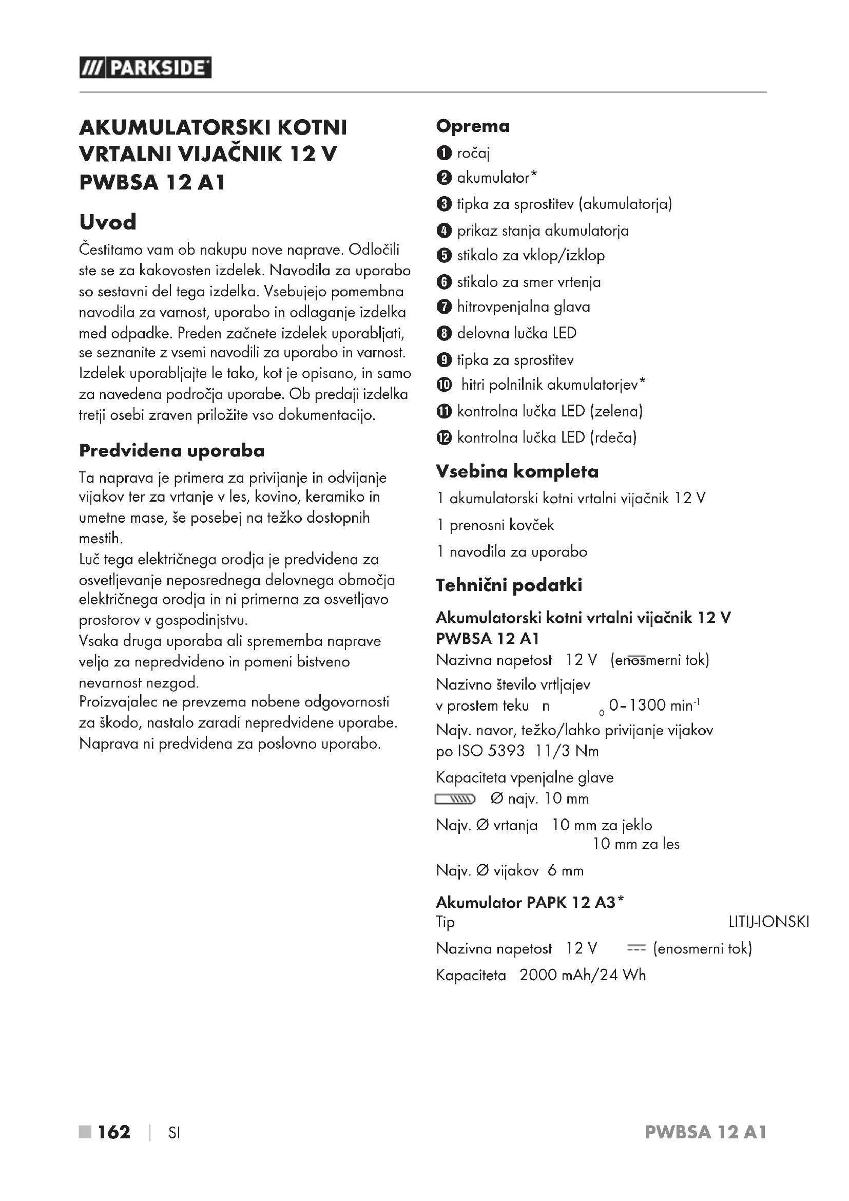 PWBSA 12 A1 Uvod Čestitamo vam ob nakupu nove naprave. Odločili ste se za kakovosten izdelek. Navodila za uporabo so sestavni del tega izdelka. Vsebujejo pomembna navodila za varnost, uporabo in odlaganje izdelka med odpadke. Preden začnete izdelek uporabljati, se seznanite z vsemi navodili za uporabo in varnost. Izdelek uporabljajte le tako, kot je opisano, in samo za navedena področja uporabe. Ob predaji izdelka tretji osebi zraven priložite vso dokumentacijo. Predvidena uporaba Ta naprava je primera za privijanje in odvijanje vijakov ter za vrtanje v les, kovino, keramiko in umetne mase, še posebej na težko dostopnih mestih. Luč tega električnega orodja je predvidena za osvetljevanje neposrednega delovnega območja električnega orodja in ni primerna za osvetljavo prostorov v gospodinjstvu. Vsaka druga uporaba ali sprememba naprave velja za nepredvideno in pomeni bistveno nevarnost nezgod. Proizvajalec ne prevzema nobene odgovornosti za škodo, nastalo zaradi nepredvidene uporabe. Naprava ni predvidena za poslovno uporabo. Oprema 1 ročaj 2 akumulator* 3 tipka za sprostitev (akumulatorja) 4 prikaz stanja akumulatorja 5 stikalo za vklop/izklop 6 stikalo za smer vrtenja 7 hitrovpenjalna glava 8 delovna lučka LED 9 tipka za sprostitev 0 hitri polnilnik akumulatorjev* q kontrolna lučka LED (zelena) w kontrolna lučka LED (rdeča) Vsebina kompleta 1 akumulatorski kotni vrtalni vijačnik 12 V 1 prenosni kovček 1 navodila za uporabo Tehnični podatki Akumulatorski kotni vrtalni vijačnik 12 V PWBSA 12 A1 Nazivna napetost 12 V (enosmerni tok) Nazivno število vrtljajev v prostem teku n