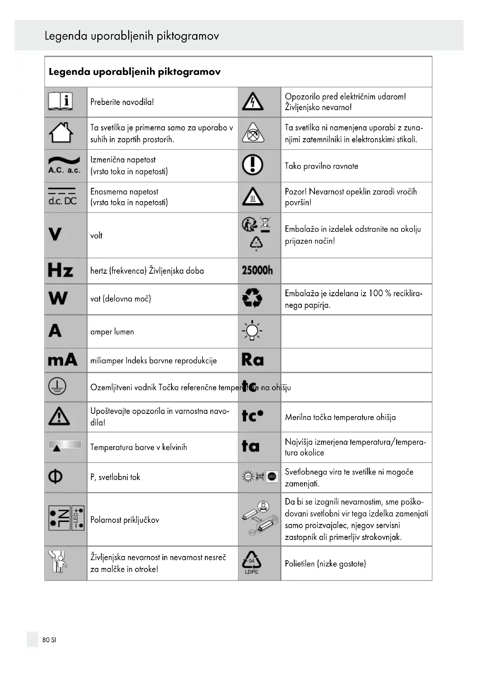 Kazalo SI 79Legenda uporabljenih piktogramov Preberite navodila! Opozorilo pred električnim udarom! Življenjsko nevarno! Ta svetilka je primerna samo za uporabo v suhih in zaprtih prostorih. Ta svetilka ni namenjena uporabi z zuna njimi zatemnilniki in elektronskimi stikali. Izmenična napetost (vrsta toka in napetosti) Tako pravilno ravnate Enosmerna napetost (vrsta toka in napetosti) Pozor! Nevarnost opeklin zaradi vročih površin! volt Embalažo in izdelek odstranite na okolju prijazen način! hertz (frekvenca) Življenjska doba vat (delovna moč) Embalaža je izdelana iz 100 % reciklira nega papirja. amper lumen miliamper Indeks barvne reprodukcije Ozemljitveni vodnik Točka referenčne temperature na ohišju Upoštevajte opozorila in varnostna navo dila! Merilna točka temperature ohišja Temperatura barve v kelvinih Najvišja izmerjena temperatura/tempera tura okolice P, svetlobni tok Svetlobnega vira te svetilke ni mogoče zamenjati.