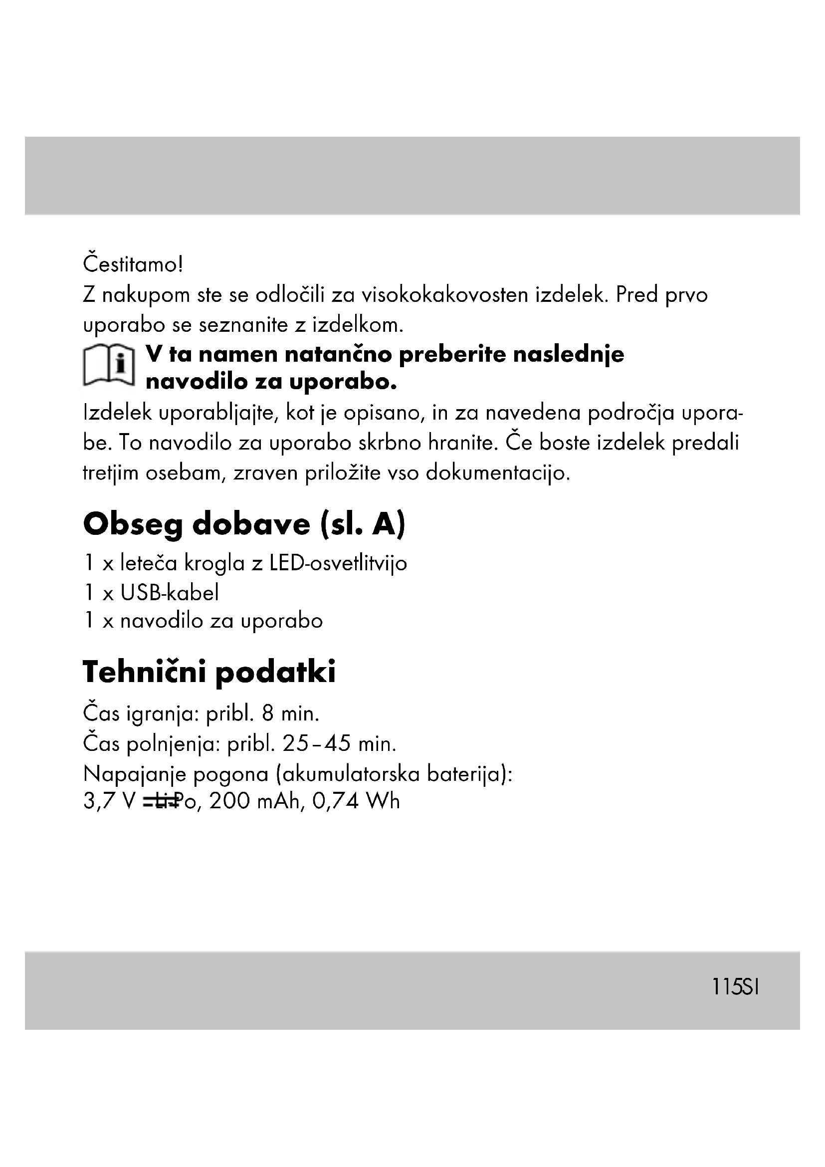 - Izdelek se sme polniti le v suhih, zaprtih notranjih prostorih. Izdelka nikoli ne polnite in ne shranjujte v bližini virov toplote ali odprtega ognja, saj lahko akumulatorska baterija eksplodira.