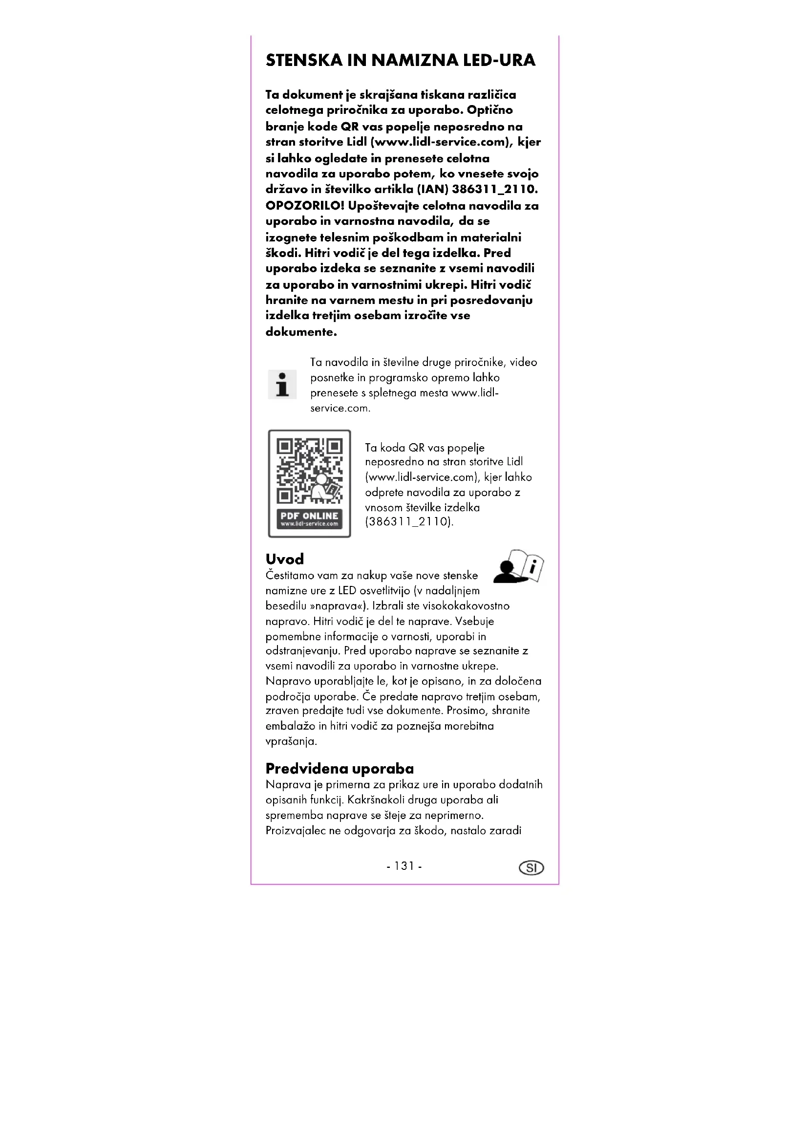 Ta koda QR vas popelje neposredno na stran storitve Lidl (www.lidl-service.com), kjer lahko odprete navodila za uporabo z vnosom številke izdelka (386311_2110). Uvod Čestitamo vam za nakup vaše nove stenske namizne ure z LED osvetlitvijo (v nadaljnjem besedilu »naprava«). Izbrali ste visokokakovostno napravo. Hitri vodič je del te naprave. Vsebuje pomembne informacije o varnosti, uporabi in odstranjevanju. Pred uporabo naprave se seznanite z vsemi navodili za uporabo in varnostne ukrepe. Napravo uporabljajte le, kot je opisano, in za določena področja uporabe. Če predate napravo tretjim osebam, zraven predajte tudi vse dokumente. Prosimo, shranite embalažo in hitri vodič za poznejša morebitna vprašanja. Predvidena uporaba Naprava je primerna za prikaz ure in uporabo dodatnih opisanih funkcij. Kakršnakoli druga uporaba ali sprememba naprave se šteje za neprimerno. Proizvajalec ne odgovarja za škodo, nastalo zaradi- 132 - nepravilne uporabe ali nepravilnega delovanja. Naprava ni namenjena komercialni uporabi. Pojasnilo simbolov