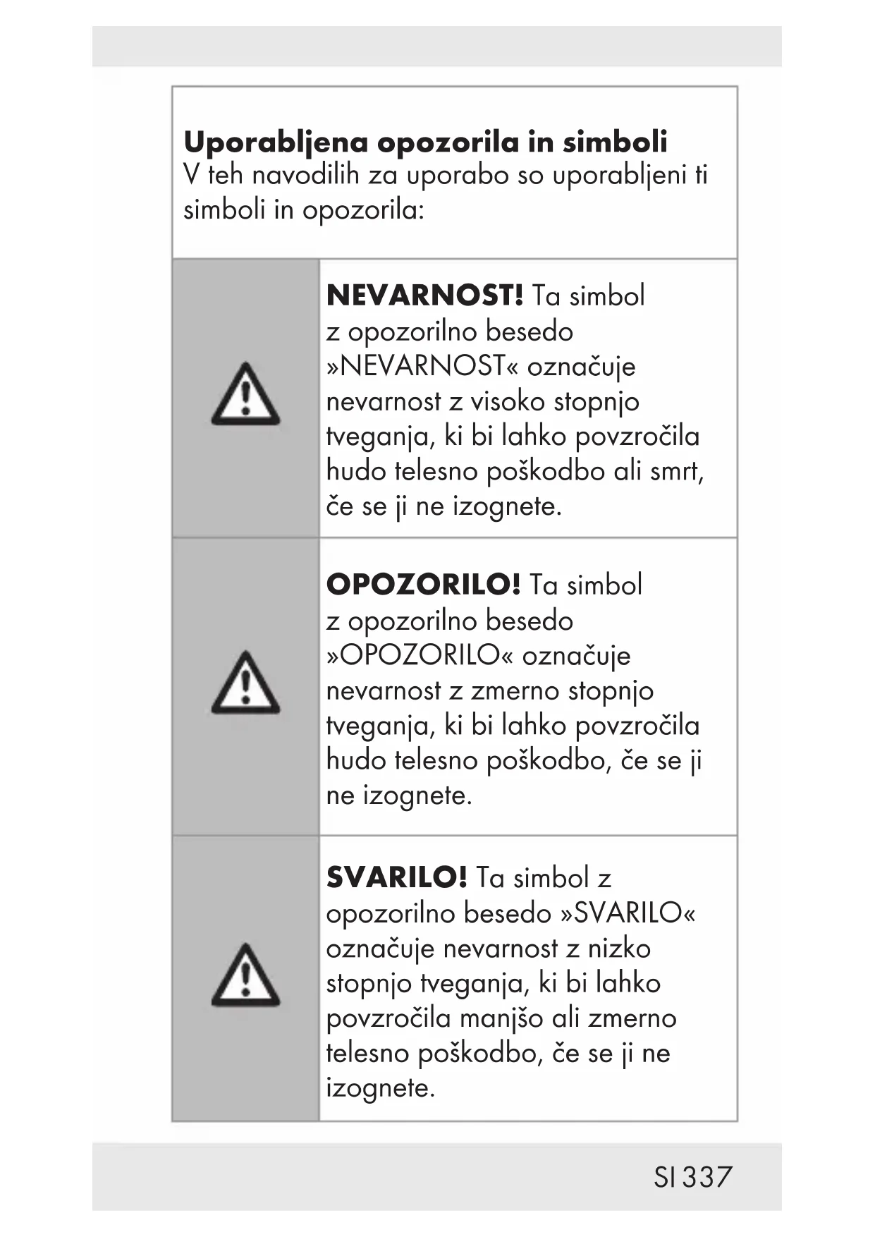 Uporabljena opozorila in simboli V teh navodilih za uporabo so uporabljeni ti simboli in opozorila: NEVARNOST! Ta simbol z opozorilno besedo »NEVARNOST« označuje nevarnost z visoko stopnjo tveganja, ki bi lahko povzročila hudo telesno poškodbo ali smrt, če se ji ne izognete. OPOZORILO! Ta simbol z opozorilno besedo »OPOZORILO« označuje nevarnost z zmerno stopnjo tveganja, ki bi lahko povzročila hudo telesno poškodbo, če se ji ne izognete. SVARILO! Ta simbol z opozorilno besedo »SVARILO« označuje nevarnost z nizko stopnjo tveganja, ki bi lahko povzročila manjšo ali zmerno telesno poškodbo, če se ji ne izognete.338 SI POZOR! Ta simbol s signalno besedo »POZOR« označuje morebitno poškodbo lastnine oziroma lahko pride do poškodbe lastnine, če se temu ne izognete. OPOMBA: Ta simbol z opozorilno besedo »OPOMBA« navaja dodatne uporabne informacije.