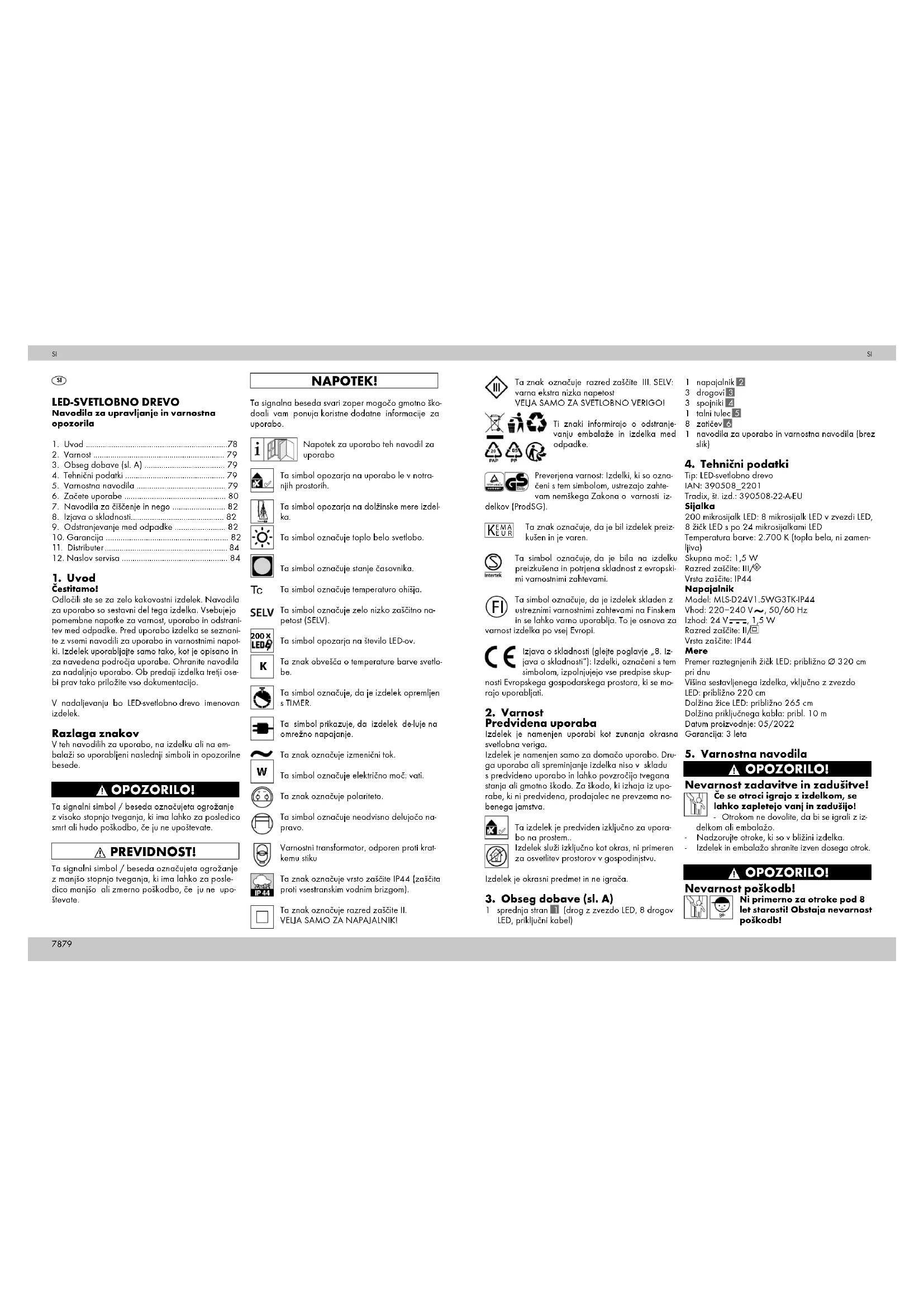 Čestitamo! Odločili ste se za zelo kakovostni izdelek. Navodila za uporabo so sestavni del tega izdelka. Vsebujejo pomembne napotke za varnost, uporabo in odstrani- tev med odpadke. Pred uporabo izdelka se seznani- te z vsemi navodili za uporabo in varnostnimi napot- ki. Izdelek uporabljajte samo tako, kot je opisano in za navedena področja uporabe. Ohranite navodila za nadaljnjo uporabo. Ob predaji izdelka tretji ose- bi prav tako priložite vso dokumentacijo. V nadaljevanju bo LED-svetlobno drevo imenovan izdelek. Razlaga znakov V teh navodilih za uporabo, na izdelku ali na em- balaži so uporabljeni naslednji simboli in opozorilne besede.