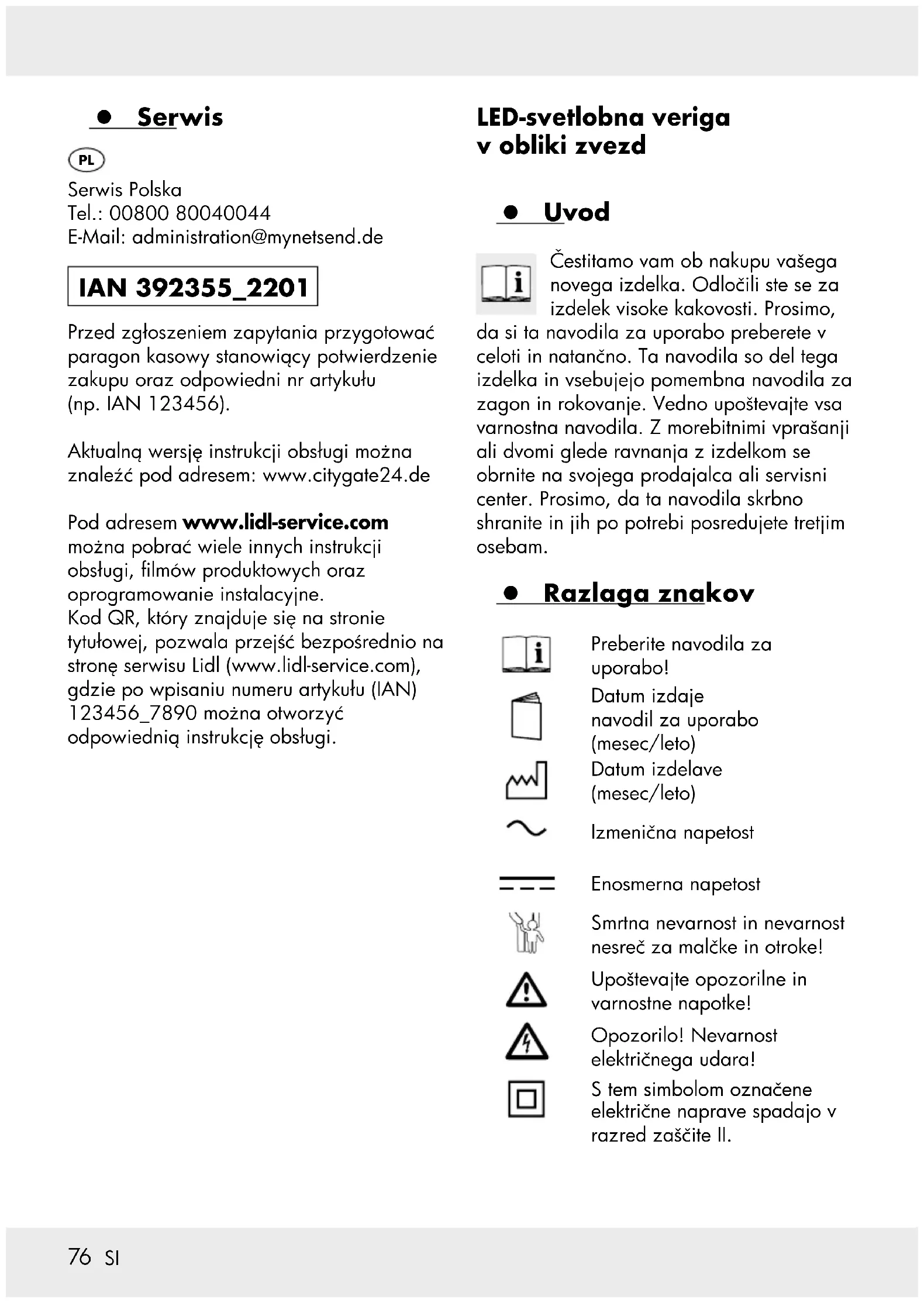 Servis Slovenija Tel.: 00800 80040044 E-Mail: roman.ostir@relectronic.si info@relectronic.si IAN 392355_2201 Prosimo, da za vse zahtevke predložite blagajniški listek in številko izdelka (npr. IAN 123456) kot potrdilo o nakupu. Zadnjo različico navodil za montažo najdete na: www.citygate24.de Te in številne druge priročnike, videoposnetke izdelkov in namestitveno programsko opremo lahko prenesete s strani www.lidl-service.com . QR-koda na naslovni strani vas pripelje neposredno na Lidlovo servisno stran (www.lidl-service.com) in z vnosom številke artikla (IAN) 123456_7890 lahko odprete svoja navodila za uporabo.83