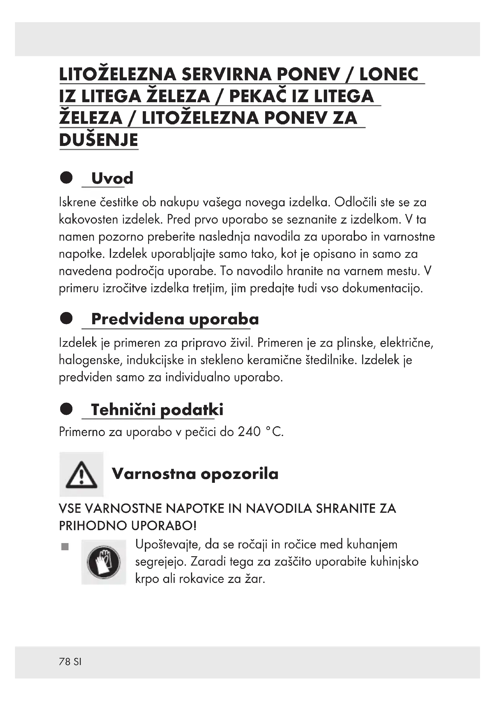 DUŠENJE Uvod Iskrene čestitke ob nakupu vašega novega izdelka. Odločili ste se za kakovosten izdelek. Pred prvo uporabo se seznanite z izdelkom. V ta namen pozorno preberite naslednja navodila za uporabo in varnostne napotke. Izdelek uporabljajte samo tako, kot je opisano in samo za navedena področja uporabe. To navodilo hranite na varnem mestu. V primeru izročitve izdelka tretjim, jim predajte tudi vso dokumentacijo. Predvidena uporaba Izdelek je primeren za pripravo živil. Primeren je za plinske, električne, halogenske, indukcijske in stekleno keramične štedilnike. Izdelek je predviden samo za individualno uporabo. Tehnični podatki Primerno za uporabo v pečici do 240 °C. Varnostna opozorila VSE VARNOSTNE NAPOTKE IN NAVODILA SHRANITE ZA PRIHODNO UPORABO!