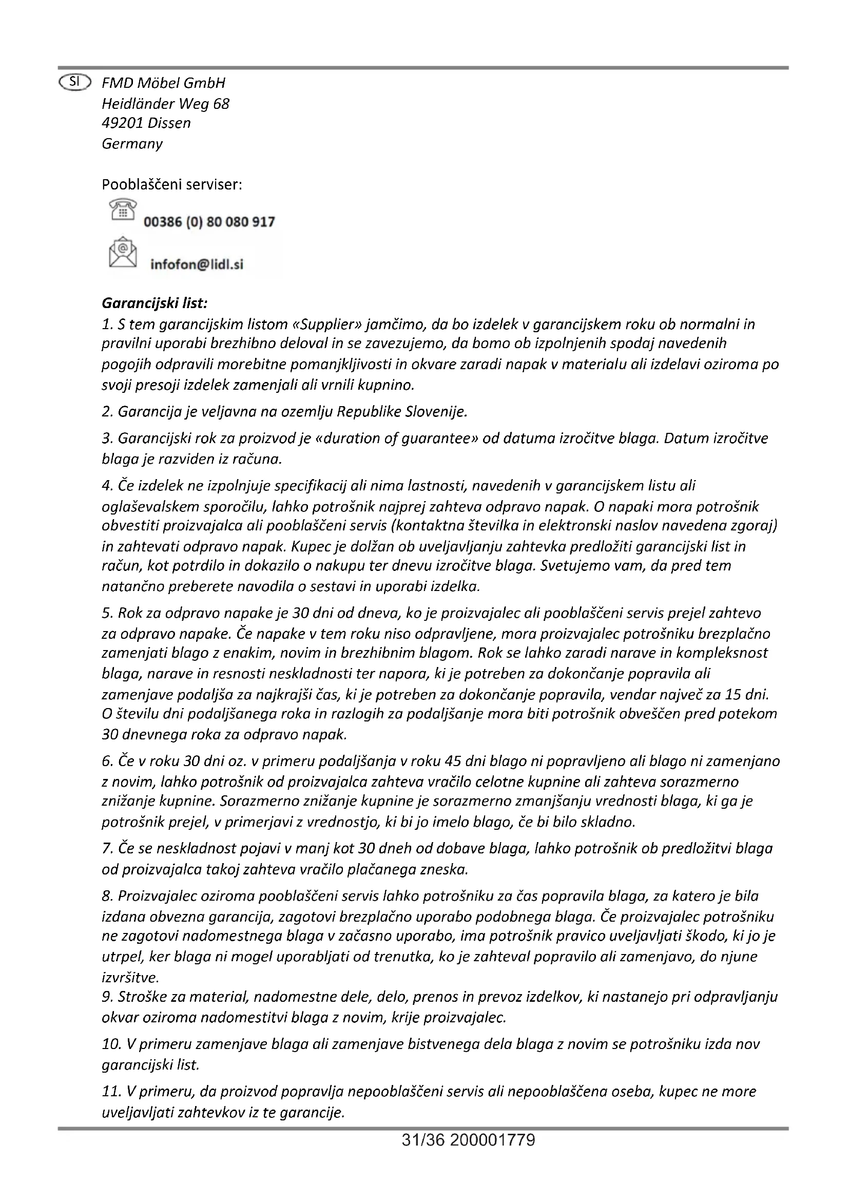 oglaševalskem sporočilu, lahko potrošnik najprej zahteva odpravo napak. O napaki mora potrošnik obvestiti proizvajalca ali pooblaščeni servis (kontaktna številka in elektronski naslov navedena zgoraj) in zahtevati odpravo napak. Kupec je dolžan ob uveljavljanju zahtevka predložiti garancijski list in račun, kot potrdilo in dokazilo o nakupu ter dnevu izročitve blaga. Svetujemo vam, da pred tem natančno preberete navodila o sestavi in uporabi izdelka.