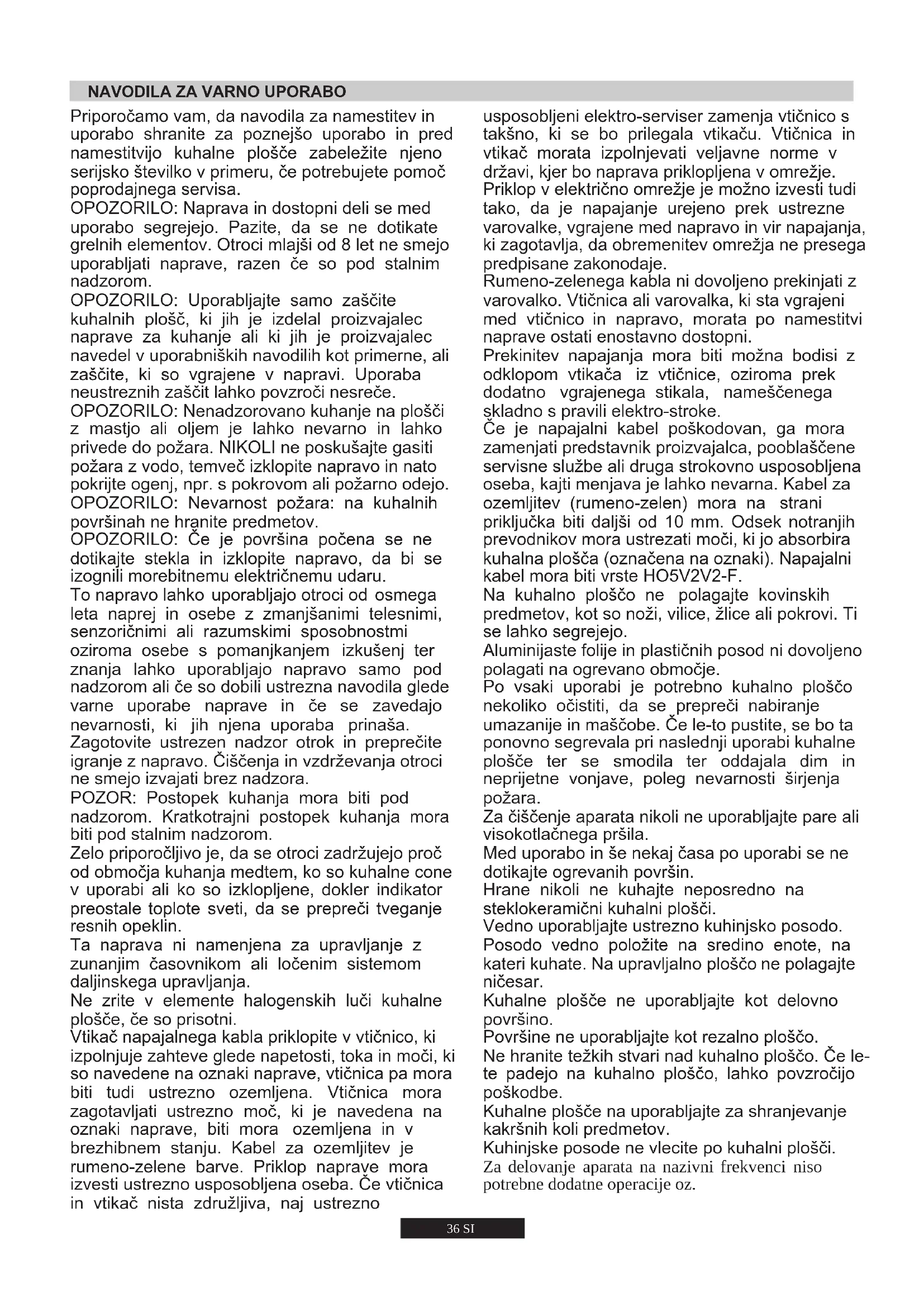 ZA UPORABNIKA Dovoljena je samo namenska uporaba kuhalne plošče, tj. za kuhanje v gospodinjstvih. Drugačna uporaba ni dovoljena in predstavlja tveganje za uporabnika. Proizvajalec ne prevzema odgovornosti za poškodbe ali škodo zaradi nenamenske uporabe.