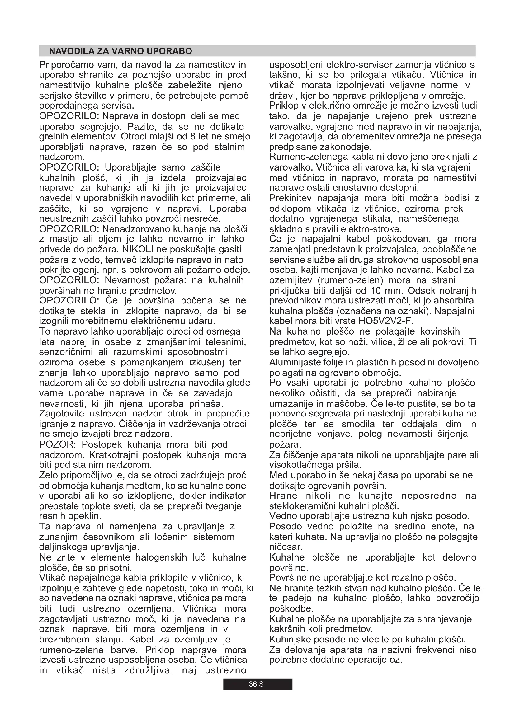 ZA UPORABNIKA Dovoljena je samo namenska uporaba kuhalne plošče, tj. za kuhanje v gospodinjstvih. Drugačna uporaba ni dovoljena in predstavlja tveganje za uporabnika. Proizvajalec ne prevzema odgovornosti za poškodbe ali škodo zaradi nenamenske uporabe.