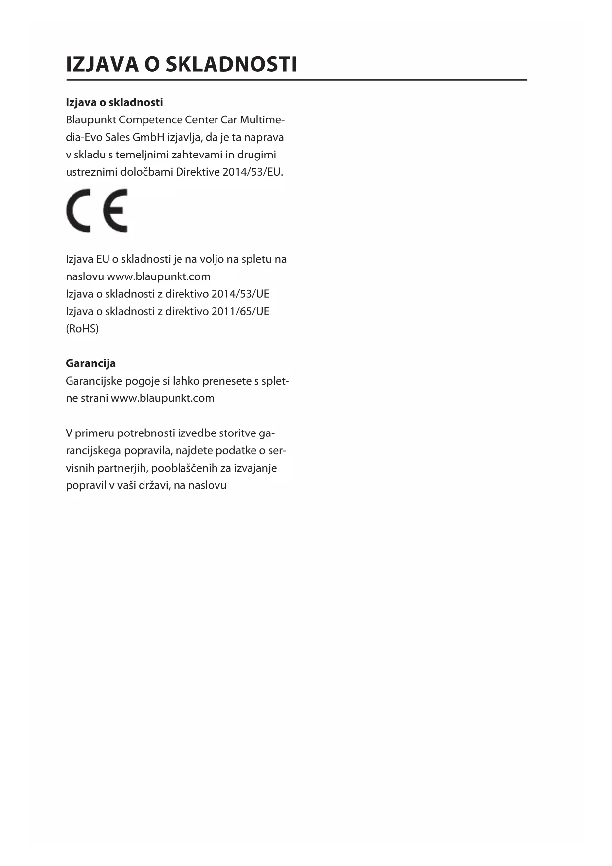 BPA 1121 BT Manual.indd 157 05.10.2021 16:15:45Izjava o skladnosti Blaupunkt Competence Center Car Multime- dia-Evo Sales GmbH izjavlja, da je ta naprava v skladu s temeljnimi zahtevami in drugimi ustreznimi določbami Direktive 2014/53/EU. Izjava EU o skladnosti je na voljo na spletu na naslovu www.blaupunkt.com Izjava o skladnosti z direktivo 2014/53/UE Izjava o skladnosti z direktivo 2011/65/UE (RoHS) Garancija Garancijske pogoje si lahko prenesete s splet- ne strani www.blaupunkt.com V primeru potrebnosti izvedbe storitve ga- rancijskega popravila, najdete podatke o ser- visnih partnerjih, pooblaščenih za izvajanje popravil v vaši državi, na naslovu