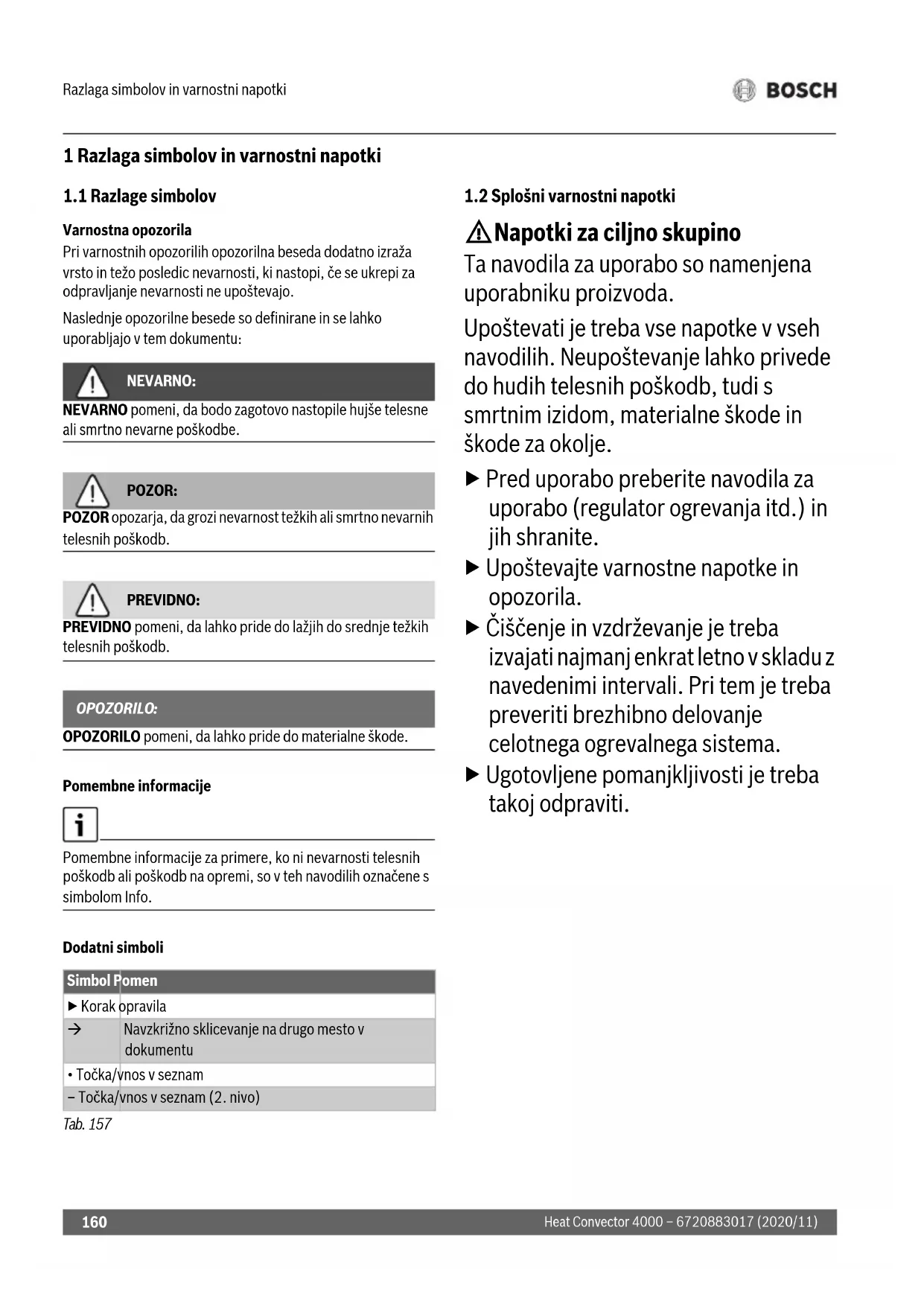 Varnostna opozorila Pri varnostnih opozorilih opozorilna beseda dodatno izraža vrsto in težo posledic nevarnosti, ki nastopi, če se ukrepi za odpravljanje nevarnosti ne upoštevajo. Naslednje opozorilne besede so definirane in se lahko uporabljajo v tem dokumentu: NEVARNO: NEVARNO pomeni, da bodo zagotovo nastopile hujše telesne ali smrtno nevarne poškodbe. POZOR: POZOR opozarja, da grozi nevarnost težkih ali smrtno nevarnih telesnih poškodb. PREVIDNO: PREVIDNO pomeni, da lahko pride do lažjih do srednje težkih telesnih poškodb. OPOZORILO: OPOZORILO pomeni, da lahko pride do materialne škode. Pomembne informacije Pomembne informacije za primere, ko ni nevarnosti telesnih poškodb ali poškodb na opremi, so v teh navodilih označene s simbolom Info. Dodatni simboli Tab. 157