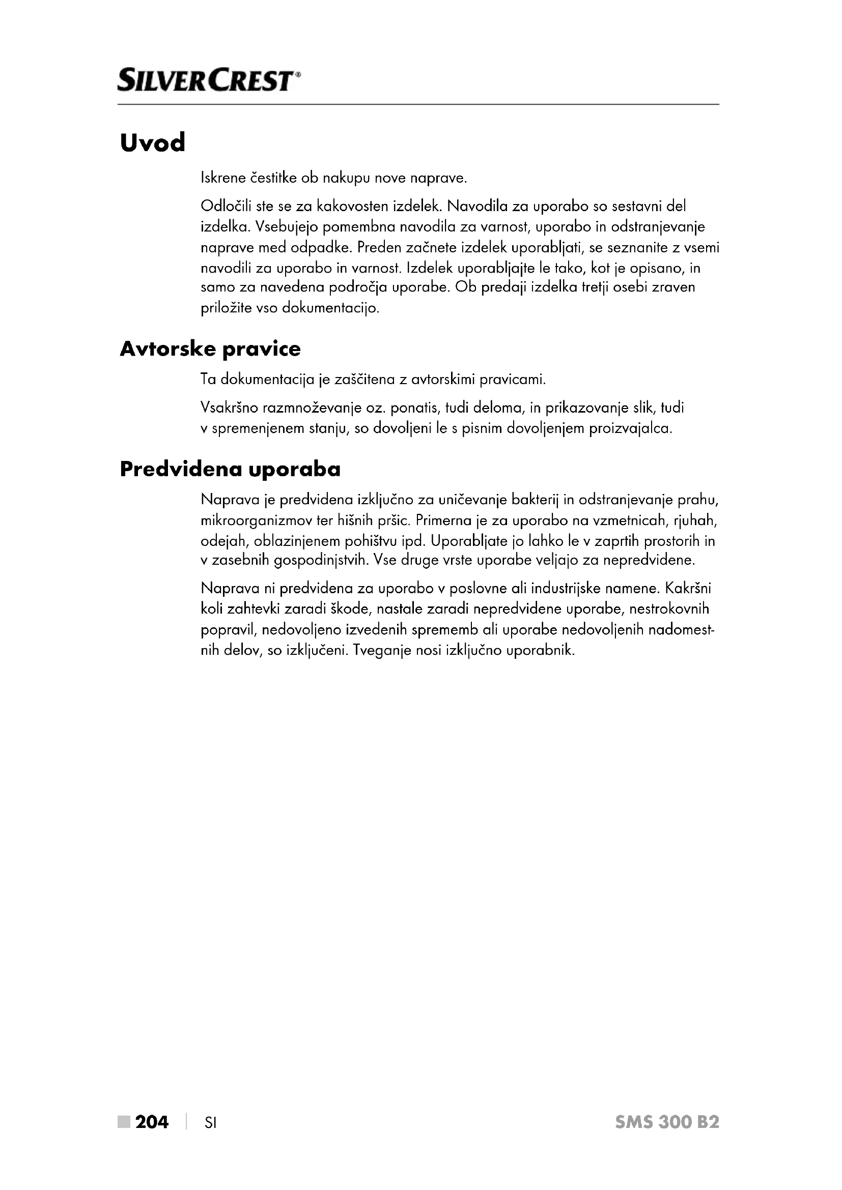 SI SMS 300 B2 Uvod Iskrene čestitke ob nakupu nove naprave. Odločili ste se za kakovosten izdelek. Navodila za uporabo so sestavni del izdelka. Vsebujejo pomembna navodila za varnost, uporabo in odstranjevanje naprave med odpadke. Preden začnete izdelek uporabljati, se seznanite z vsemi navodili za uporabo in varnost. Izdelek uporabljajte le tako, kot je opisano, in samo za navedena področja uporabe. Ob predaji izdelka tretji osebi zraven priložite vso dokumentacijo. Avtorske pravice Ta dokumentacija je zaščitena z avtorskimi pravicami. Vsakršno razmnoževanje oz. ponatis, tudi deloma, in prikazovanje slik, tudi v spremenjenem stanju, so dovoljeni le s pisnim dovoljenjem proizvajalca. Predvidena uporaba Naprava je predvidena izključno za uničevanje bakterij in odstranjevanje prahu, mikroorganizmov ter hišnih pršic. Primerna je za uporabo na vzmetnicah, rjuhah, odejah, oblazinjenem pohištvu ipd. Uporabljate jo lahko le v zaprtih prostorih in v zasebnih gospodinjstvih. Vse druge vrste uporabe veljajo za nepredvidene. Naprava ni predvidena za uporabo v poslovne ali industrijske namene. Kakršni koli zahtevki zaradi škode, nastale zaradi nepredvidene uporabe, nestrokovnih popravil, nedovoljeno izvedenih sprememb ali uporabe nedovoljenih nadomest- nih delov, so izključeni. Tveganje nosi izključno uporabnik.SI