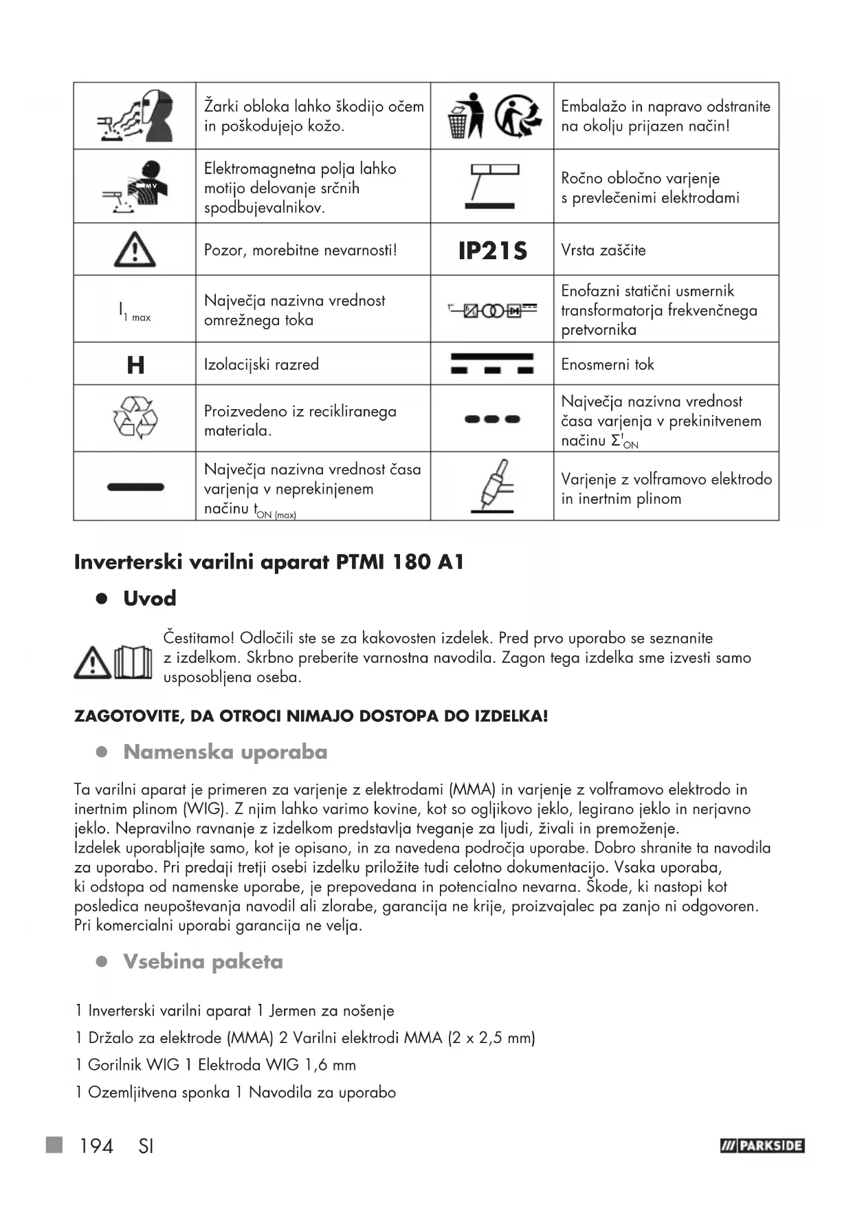 Največja nazivna vrednost časa varjenja v neprekinjenem načinu t ON (max) Varjenje z volframovo elektrodo in inertnim plinom Inverterski varilni aparat PTMI 180 A1 z Uvod Čestitamo! Odločili ste se za kakovosten izdelek. Pred prvo uporabo se seznanite z izdelkom. Skrbno preberite varnostna navodila. Zagon tega izdelka sme izvesti samo usposobljena oseba. ZAGOTOVITE, DA OTROCI NIMAJO DOSTOPA DO IZDELKA! z Namenska uporaba Ta varilni aparat je primeren za varjenje z elektrodami (MMA) in varjenje z volframovo elektrodo in inertnim plinom (WIG). Z njim lahko varimo kovine, kot so ogljikovo jeklo, legirano jeklo in nerjavno jeklo. Nepravilno ravnanje z izdelkom predstavlja tveganje za ljudi, živali in premoženje. Izdelek uporabljajte samo, kot je opisano, in za navedena področja uporabe. Dobro shranite ta navodila za uporabo. Pri predaji tretji osebi izdelku priložite tudi celotno dokumentacijo. Vsaka uporaba, ki odstopa od namenske uporabe, je prepovedana in potencialno nevarna. Škode, ki nastopi kot posledica neupoštevanja navodil ali zlorabe, garancija ne krije, proizvajalec pa zanjo ni odgovoren. Pri komercialni uporabi garancija ne velja. z Vsebina paketa 1 Inverterski varilni aparat 1 Jermen za nošenje 1 Držalo za elektrode (MMA) 2 Varilni elektrodi MMA (2 x 2,5 mm) 1 Gorilnik WIG 1 Elektroda WIG 1,6 mm 1 Ozemljitvena sponka 1 Navodila za uporaboSI