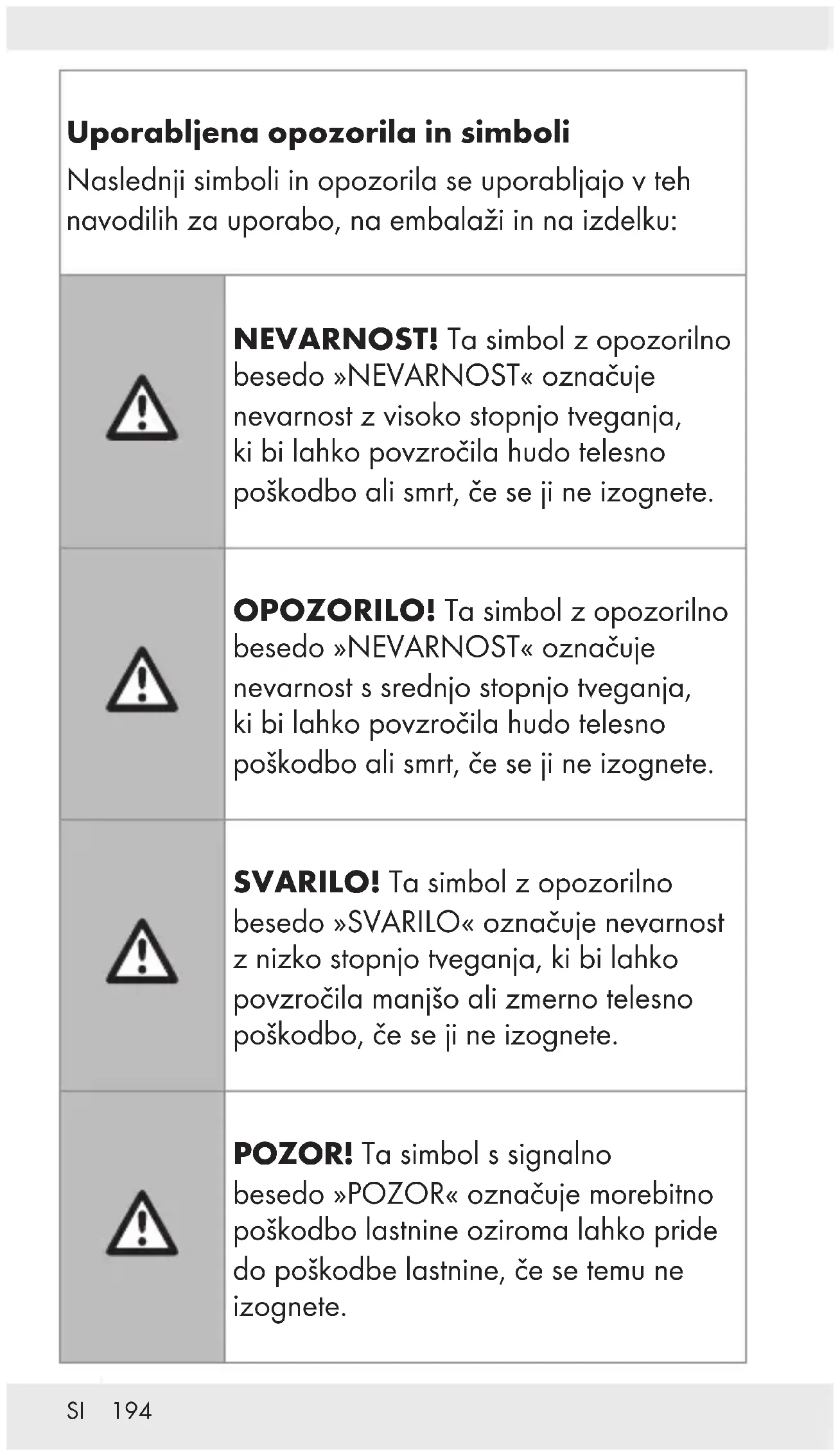 NESREČE ZA DOJENČKE IN OTROKE!SI 198 Nevarnost zadušitve! Otrok nikoli ne puščajte brez nadzora z embalažnim materialom. Embalažni material predstavlja nevarnost zadušitve. Otroci pogosto podcenjujejo nevarnost. Embalažni material ni igrača. Ta izdelek lahko uporabljajo otroci, stari 8 let in starejši, in osebe z zmanjšanimi telesnimi, čutnimi ali duševnimi sposobnostmi ali osebe, ki nimajo izkušenj in/ali znanja, če so pod nadzorom ali so dobile navodila glede varne uporabe izdelka in razumejo tveganja, povezana z uporabo. Otrokom ne dovolite igranja z izdelkom. Otroci ne smejo brez nadzora čistiti izdelka ali opravljati vzdrževalnih del. Izdelek ni igrača. NEVARNOST!