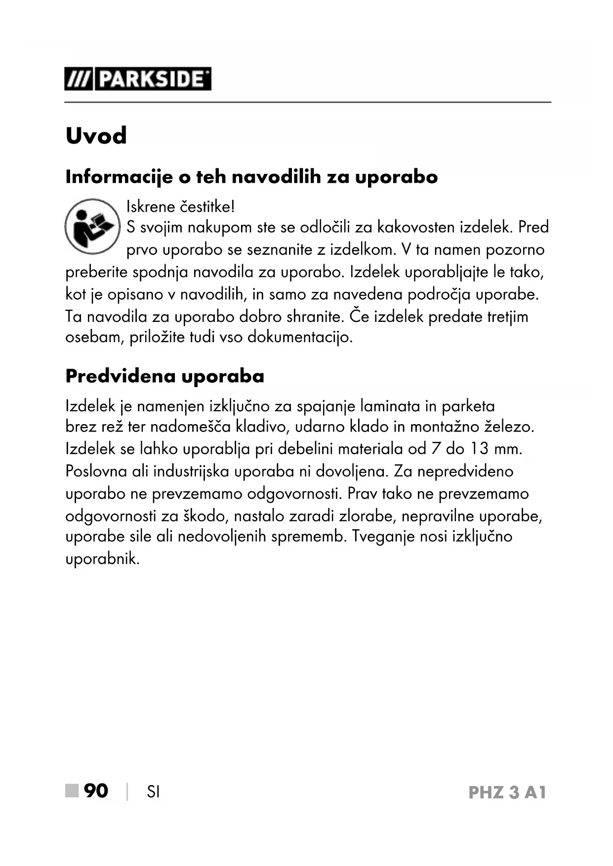 SI Uvod Informacije o teh navodilih za uporabo Iskrene čestitke! S svojim nakupom ste se odločili za kakovosten izdelek. Pred prvo uporabo se seznanite z izdelkom. V ta namen pozorno preberite spodnja navodila za uporabo. Izdelek uporabljajte le tako, kot je opisano v navodilih, in samo za navedena področja uporabe. Ta navodila za uporabo dobro shranite. Če izdelek predate tretjim osebam, priložite tudi vso dokumentacijo. Predvidena uporaba Izdelek je namenjen izključno za spajanje laminata in parketa brez rež ter nadomešča kladivo, udarno klado in montažno železo. Izdelek se lahko uporablja pri debelini materiala od 7 do 13 mm. Poslovna ali industrijska uporaba ni dovoljena. Za nepredvideno uporabo ne prevzemamo odgovornosti. Prav tako ne prevzemamo odgovornosti za škodo, nastalo zaradi zlorabe, nepravilne uporabe, uporabe sile ali nedovoljenih sprememb. Tveganje nosi izključno uporabnik. IB_380558_PHZ3A1_LB8.indb 90 01.04.2022 13:23:14PHZ 3 A1 SI