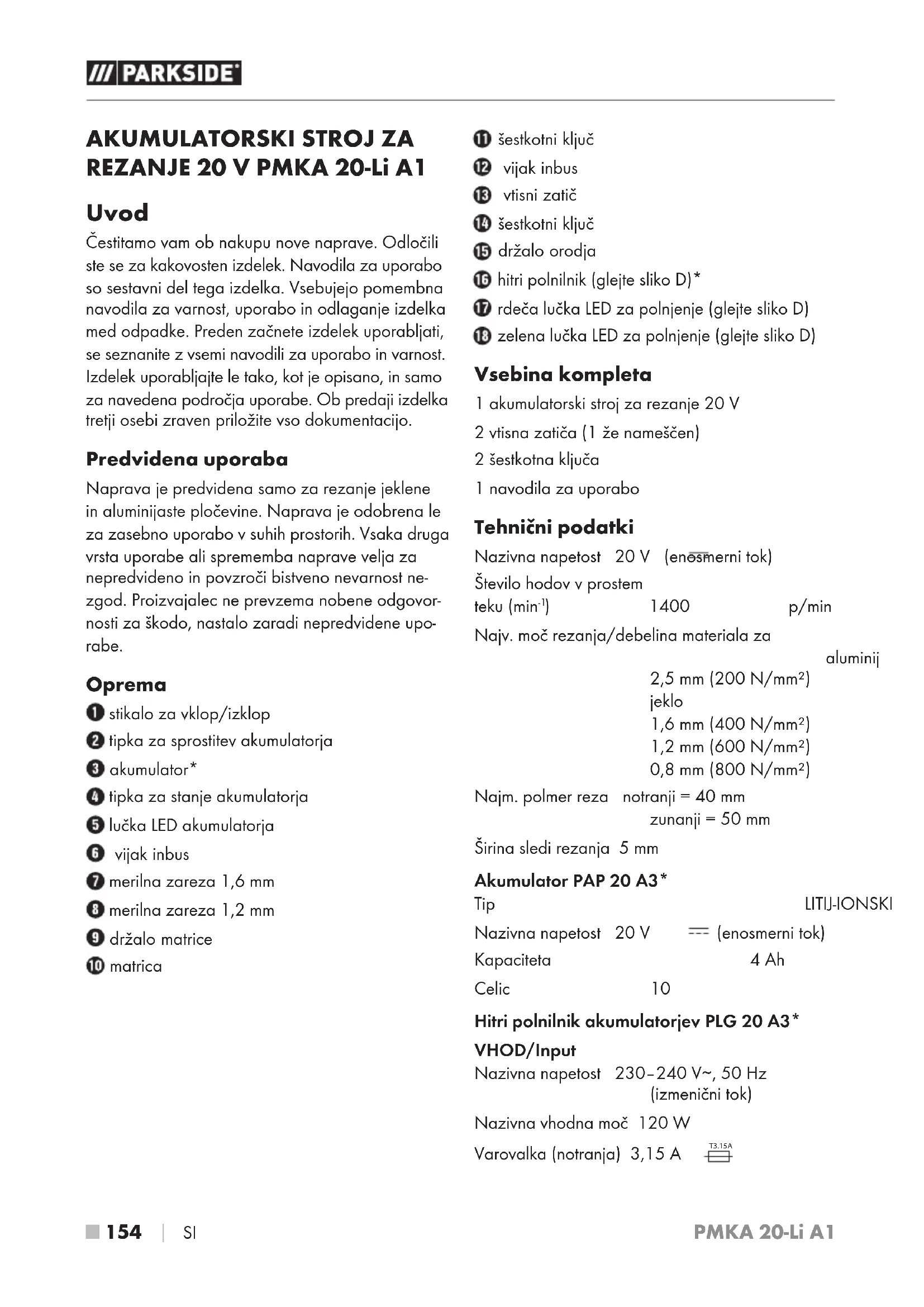 a) Električno orodje dajte v popravilo samo usposobljenemu strokovnemu osebju, ki naj uporablja izključno originalne nadomestne dele. S tem zagotovite, da se ohrani varnost električnega orodja. b) Poškodovanih akumulatorjev nikoli ne vzdr- žujte. Vsakršno vzdrževanje akumulatorjev naj izvaja izključno proizvajalec ali pooblaščena servisna služba. Varnostna navodila za škarje zapločevino ■ Orodje trdno držite. ■ Obdelovanec brezhibno zavarujte. ■ Rok ne približujte vrtljivim delom. ■ Robovi in ostružki obdelovanca so ostri. Nosite rokavice. Da se obvarujete pred telesnimi po- škodbami, je priporočljivo tudi, da nosite čevlje z debelimi podplati. ■ Orodja ne polagajte na ostružke obdelovanca. V nasprotnem primeru lahko pride do poškodb in motenj v delovanju orodja. ■ Orodja ne pustite delovati brez nadzora. Napravo v položaju držite samo z rokami. ■ Vedno pazite na varen položaj. Če napravo uporabljate na visoko ležečih delovnih mestih, se prepričajte, da pod njo ni nobene osebe. ■ Takoj po obdelavi se ne dotikajte vtisnega zatiča, matrice ali obdelovanca, saj so deli še zelo vroči in lahko povzročijo opekline na koži. ■ Preprečite prerez električnih kablov. To lahko povzroči hude nesreče zaradi električnega udara. Originalni pribor/dodatne naprave ■ Uporabljajte samo pribor in dodatne naprave, ki so navedeni v navodilih za uporabo oziroma imajo pritrdilne nastavke, skladne z napravo. OPOZORILO! ■ Ne uporabljajte pribora, ki ga ni priporočil PARKSIDE. To lahko povzroči električni udar in ogenj. Varnostna navodila za polnilnike ■ Otroci od 8. leta starosti nap- rej in osebe z zmanjšanimi te- lesnimi, zaznavnimi ali dušev- nimi sposobnostmi ali s pomanjkljivimi izkušnjami in znanjem smejo napravo upo- rabljati le pod nadzorom ali če so bili poučeni o varni upo- rabi naprave in so razumeli nevarnosti, ki izhajajo iz njene uporabe. Otroci se z napravo ne smejo igrati. Otro- ci brez nadzora ne smejo čistiti ali opravljati uporabniškega vzdrže vanja naprave. ■ Če je električni priključni kabel pri tej napravi poškodovan, ga mora zamenjati proizvajalec, njegova servisna služba ali po- dobno usposobljena oseba, da ne pride do nevarnosti. Polnilnik je primeren samo za uporabo v zaprtih prostorih.PMKA 20-Li A1 SI