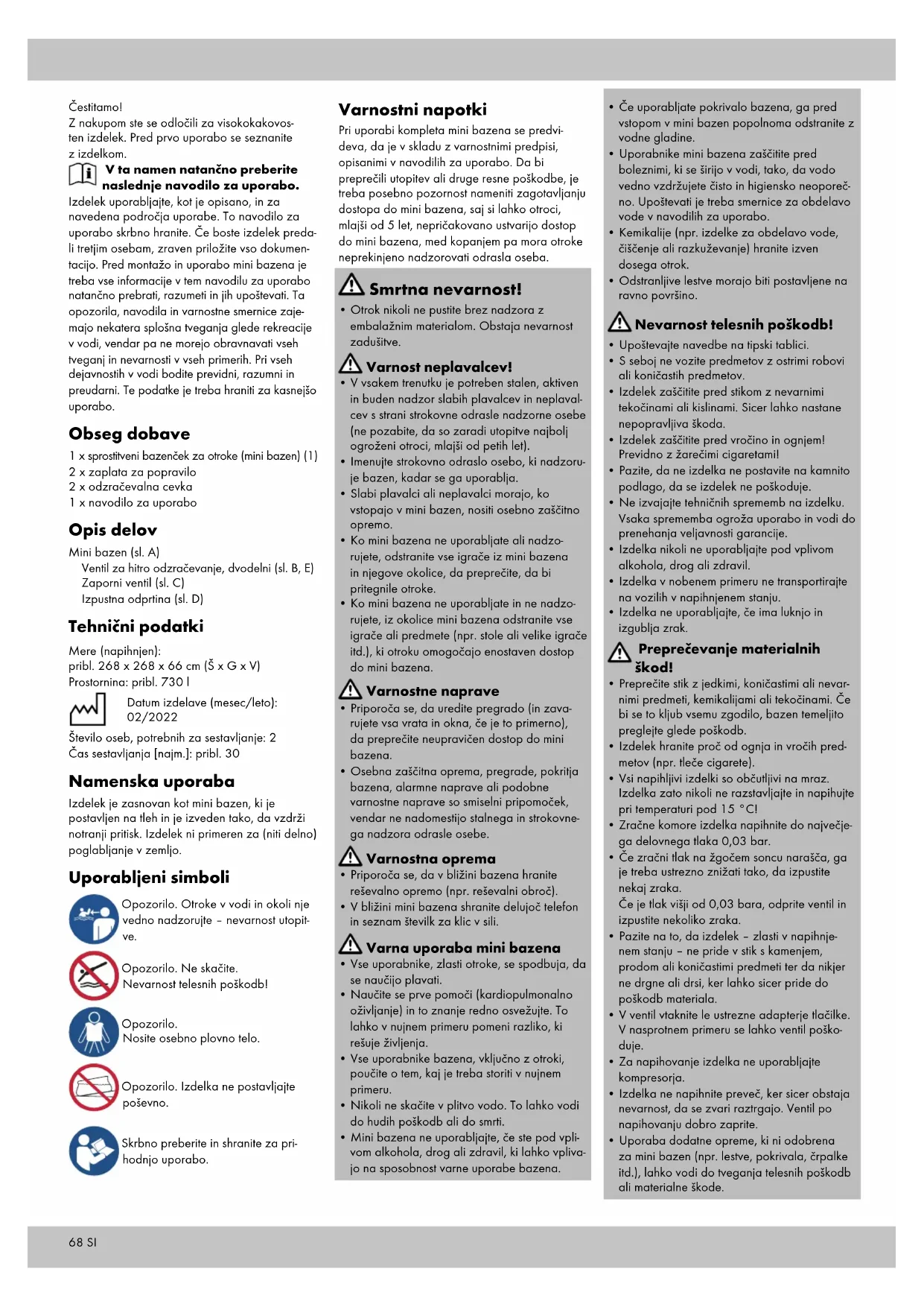 - Uporaba dodatne opreme, ki ni odobrena za mini bazen (npr. lestve, pokrivala, črpalke itd.), lahko vodi do tveganja telesnih poškodb ali materialne škode.69SI