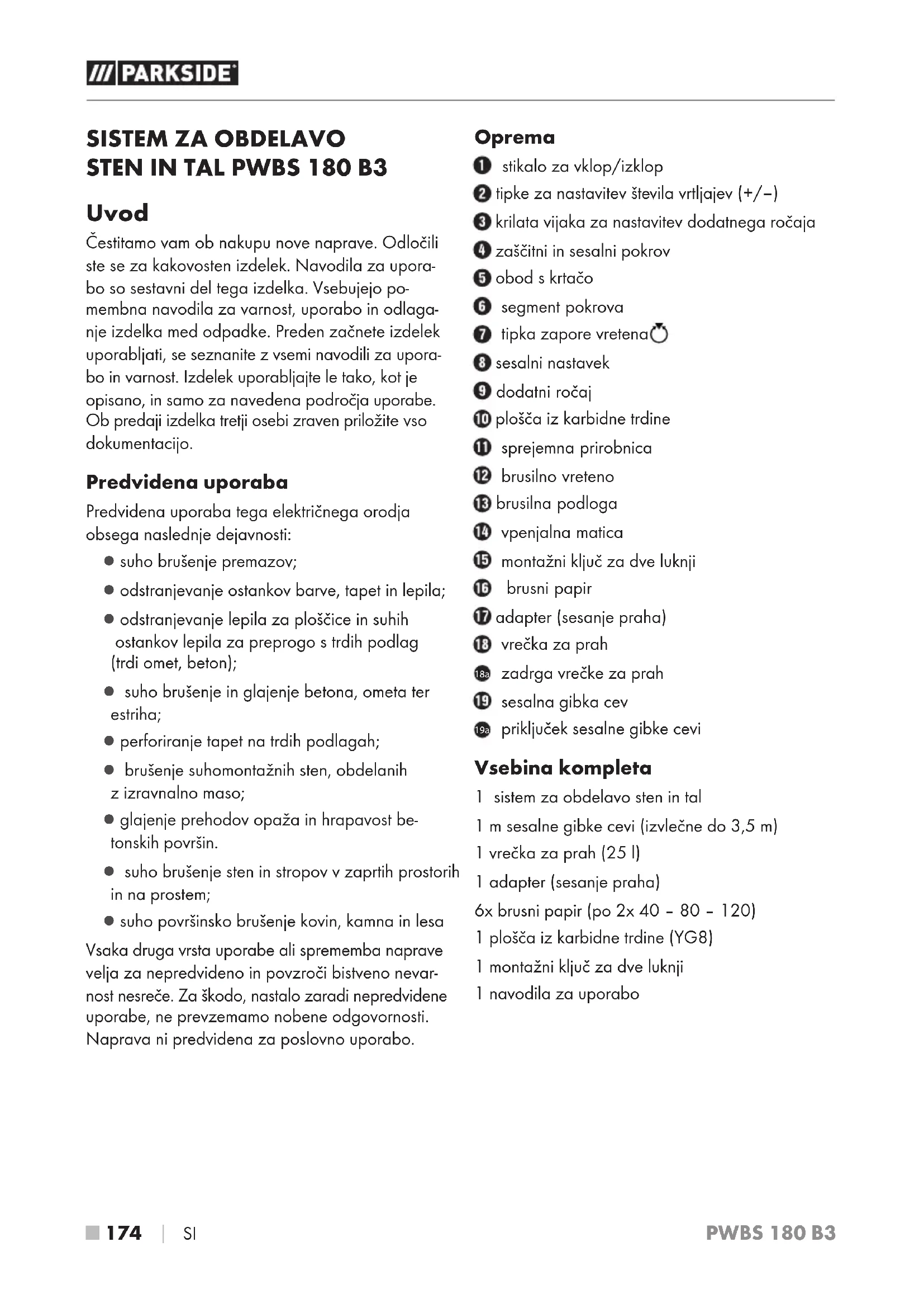 Uvod Čestitamo vam ob nakupu nove naprave. Odločili ste se za kakovosten izdelek. Navodila za upora- bo so sestavni del tega izdelka. Vsebujejo po- membna navodila za varnost, uporabo in odlaga- nje izdelka med odpadke. Preden začnete izdelek uporabljati, se seznanite z vsemi navodili za upora- bo in varnost. Izdelek uporabljajte le tako, kot je opisano, in samo za navedena področja uporabe. Ob predaji izdelka tretji osebi zraven priložite vso dokumentacijo. Predvidena uporaba Predvidena uporaba tega električnega orodja obsega naslednje dejavnosti: ▯ suho brušenje premazov; ▯ odstranjevanje ostankov barve, tapet in lepila; ▯ odstranjevanje lepila za ploščice in suhih ostankov lepila za preprogo s trdih podlag (trdi omet, beton); ▯ suho brušenje in glajenje betona, ometa ter estriha; ▯ perforiranje tapet na trdih podlagah; ▯ brušenje suhomontažnih sten, obdelanih z izravnalno maso; ▯ glajenje prehodov opaža in hrapavost be- tonskih površin. ▯ suho brušenje sten in stropov v zaprtih prostorih in na prostem; ▯ suho površinsko brušenje kovin, kamna in lesa Vsaka druga vrsta uporabe ali sprememba naprave velja za nepredvideno in povzroči bistveno nevar- nost nesreče. Za škodo, nastalo zaradi nepredvidene uporabe, ne prevzemamo nobene odgovornosti. Naprava ni predvidena za poslovno uporabo. Oprema stikalo za vklop/izklop tipke za nastavitev števila vrtljajev (+/–) krilata vijaka za nastavitev dodatnega ročaja zaščitni in sesalni pokrov obod s krtačo segment pokrova tipka zapore vretena sesalni nastavek dodatni ročaj plošča iz karbidne trdine sprejemna prirobnica brusilno vreteno brusilna podloga vpenjalna matica montažni ključ za dve luknji brusni papir adapter (sesanje praha) vrečka za prah 18a zadrga vrečke za prah sesalna gibka cev 19a priključek sesalne gibke cevi Vsebina kompleta 1 sistem za obdelavo sten in tal 1 m sesalne gibke cevi (izvlečne do 3,5m) 1 vrečka za prah (25l) 1 adapter (sesanje praha) 6x brusni papir (po 2x 40 – 80 – 120) 1 plošča iz karbidne trdine (YG8) 1 montažni ključ za dve luknji 1 navodila za uporaboPWBS 180 B3 SI