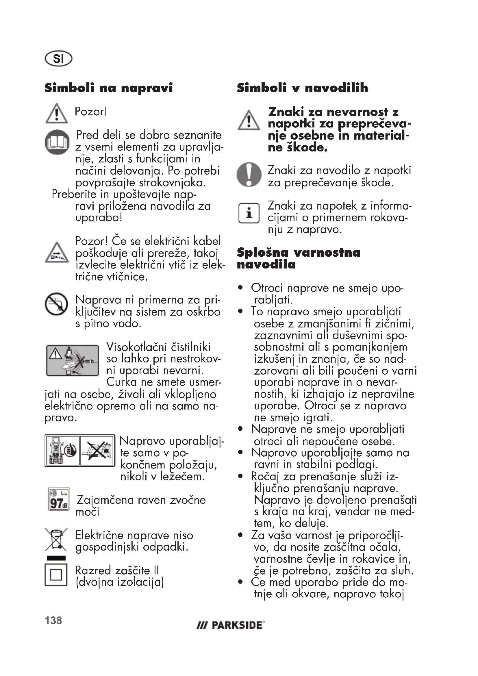 Simboli na napravi Pozor! Pred deli se dobro seznanite z vsemi elementi za upravlja- nje, zlasti s funkcijami in načini delovanja. Po potrebi povprašajte strokovnjaka. Preberite in upoštevajte nap- ravi priložena navodila za uporabo! Pozor! Če se električni kabel poškoduje ali prereže, takoj izvlecite električni vtič iz elek- trične vtičnice. Naprava ni primerna za pri- ključitev na sistem za oskrbo s pitno vodo. Visokotlačni čistilniki so lahko pri nestrokov- ni uporabi nevarni. Curka ne smete usmer- jati na osebe, živali ali vklopljeno električno opremo ali na samo na- pravo. Napravo uporabljaj- te samo v po- končnem položaju, nikoli v ležečem. Zajamčena raven zvočne moči Električne naprave niso gospodinjski odpadki. Razred zaščite II (dvojna izolacija) Simboli v navodilih Znaki za nevarnost z napotki za preprečeva- nje osebne in material- ne škode. Znaki za navodilo z napotki za preprečevanje škode. Znaki za napotek z informa- cijami o primernem rokova- nju z napravo. Splošna varnostna navodila