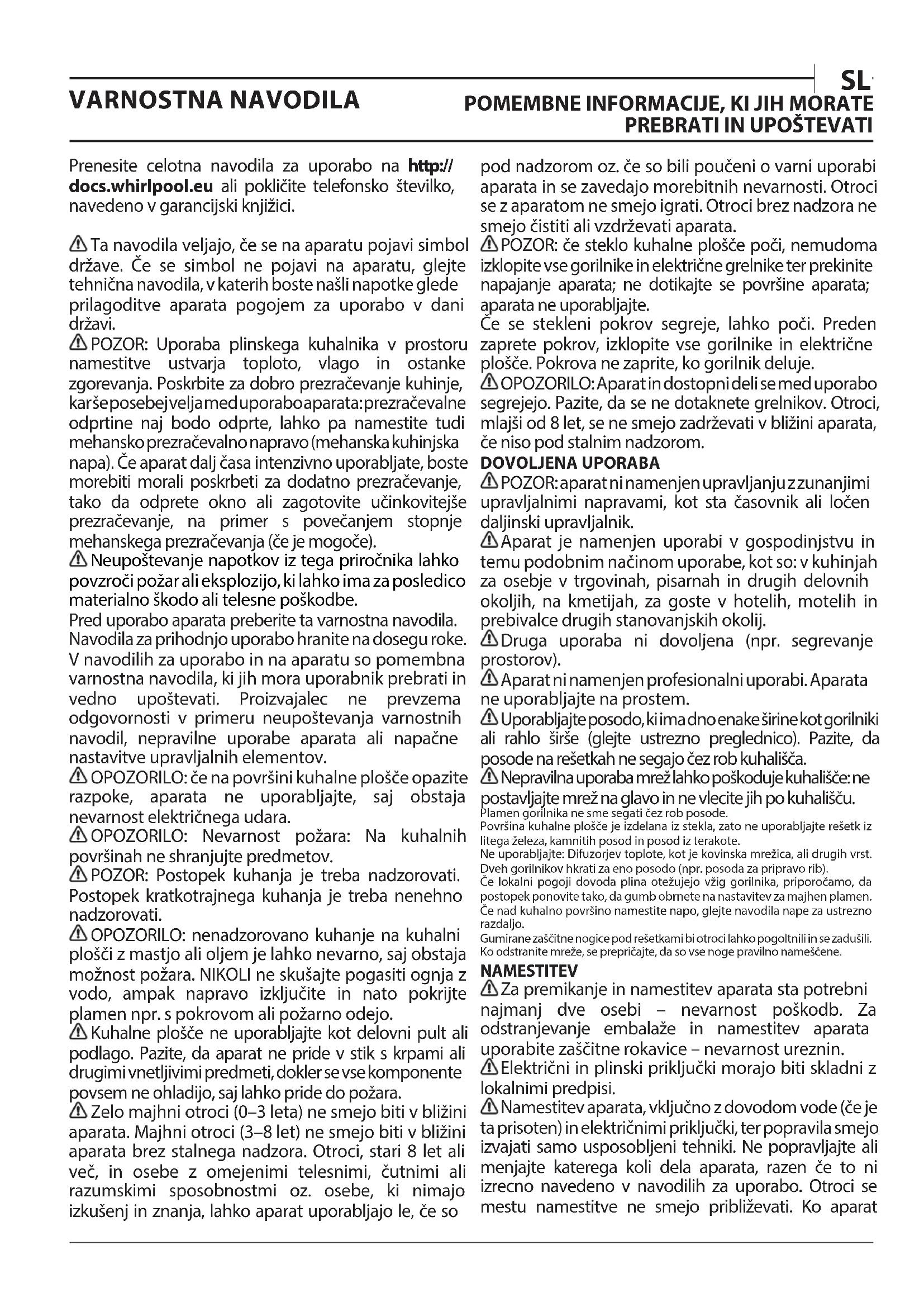 - vaše telefónne číslo. Ak je nevyhnutné spotrebič opraviť, obráťte sa na autorizované servisné stredisko (zaručí sa tým použitie originálnych náhradných dielov a správny postup pri oprave).Prenesite celotna navodila za uporabo na http:// docs.whirlpool.eu ali pokličite telefonsko številko, navedeno v garancijski knjižici. Ta navodila veljajo, če se na aparatu pojavi simbol države. Če se simbol ne pojavi na aparatu, glejte tehnična navodila, v katerih boste našli napotke glede prilagoditve aparata pogojem za uporabo v dani državi. POZOR: Uporaba plinskega kuhalnika v prostoru namestitve ustvarja toploto, vlago in ostanke zgorevanja. Poskrbite za dobro prezračevanje kuhinje, kar še posebej velja med uporabo aparata: prezračevalne odprtine naj bodo odprte, lahko pa namestite tudi mehansko prezračevalno napravo (mehanska kuhinjska napa). Če aparat dalj časa intenzivno uporabljate, boste morebiti morali poskrbeti za dodatno prezračevanje, tako da odprete okno ali zagotovite učinkovitejše prezračevanje, na primer s povečanjem stopnje mehanskega prezračevanja (če je mogoče). Neupoštevanje napotkov iz tega priročnika lahko povzroči požar ali eksplozijo, ki lahko ima za posledico materialno škodo ali telesne poškodbe. Pred uporabo aparata preberite ta varnostna navodila. Navodila za prihodnjo uporabo hranite na dosegu roke. V navodilih za uporabo in na aparatu so pomembna varnostna navodila, ki jih mora uporabnik prebrati in vedno upoštevati. Proizvajalec ne prevzema odgovornosti v primeru neupoštevanja varnostnih navodil, nepravilne uporabe aparata ali napačne nastavitve upravljalnih elementov. OPOZORILO: če na površini kuhalne plošče opazite razpoke, aparata ne uporabljajte, saj obstaja nevarnost električnega udara. OPOZORILO: Nevarnost požara: Na kuhalnih površinah ne shranjujte predmetov. POZOR: Postopek kuhanja je treba nadzorovati. Postopek kratkotrajnega kuhanja je treba nenehno nadzorovati. OPOZORILO: nenadzorovano kuhanje na kuhalni plošči z mastjo ali oljem je lahko nevarno, saj obstaja možnost požara. NIKOLI ne skušajte pogasiti ognja z vodo, ampak napravo izključite in nato pokrijte plamen npr. s pokrovom ali požarno odejo. Kuhalne plošče ne uporabljajte kot delovni pult ali podlago. Pazite, da aparat ne pride v stik s krpami ali drugimi vnetljivimi predmeti, dokler se vse komponente povsem ne ohladijo, saj lahko pride do požara. Zelo majhni otroci (0–3leta) ne smejo biti v bližini aparata. Majhni otroci (3–8let) ne smejo biti v bližini aparata brez stalnega nadzora. Otroci, stari 8 let ali več, in osebe z omejenimi telesnimi, čutnimi ali razumskimi sposobnostmi oz. osebe, ki nimajo izkušenj in znanja, lahko aparat uporabljajo le, če so pod nadzorom oz. če so bili poučeni o varni uporabi aparata in se zavedajo morebitnih nevarnosti. Otroci se z aparatom ne smejo igrati. Otroci brez nadzora ne smejo čistiti ali vzdrževati aparata. POZOR: če steklo kuhalne plošče poči, nemudoma izklopite vse gorilnike in električne grelnike ter prekinite napajanje aparata; ne dotikajte se površine aparata; aparata ne uporabljajte. Če se stekleni pokrov segreje, lahko poči. Preden zaprete pokrov, izklopite vse gorilnike in električne plošče. Pokrova ne zaprite, ko gorilnik deluje. OPOZORILO: Aparat in dostopni deli se med uporabo segrejejo. Pazite, da se ne dotaknete grelnikov. Otroci, mlajši od 8let, se ne smejo zadrževati v bližini aparata, če niso pod stalnim nadzorom. DOVOLJENA UPORABA POZOR: aparat ni namenjen upravljanju z zunanjimi upravljalnimi napravami, kot sta časovnik ali ločen daljinski upravljalnik. Aparat je namenjen uporabi v gospodinjstvu in temu podobnim načinom uporabe, kot so: v kuhinjah za osebje v trgovinah, pisarnah in drugih delovnih okoljih, na kmetijah, za goste v hotelih, motelih in prebivalce drugih stanovanjskih okolij. Druga uporaba ni dovoljena (npr. segrevanje prostorov). Aparat ni namenjen profesionalni uporabi. Aparata ne uporabljajte na prostem. Uporabljajte posodo, ki ima dno enake širine kot gorilniki ali rahlo širše (glejte ustrezno preglednico). Pazite, da posode na rešetkah ne segajo čez rob kuhališča. Nepravilna uporaba mrež lahko poškoduje kuhališče: ne postavljajte mrež na glavo in ne vlecite jih po kuhališču. Plamen gorilnika ne sme segati čez rob posode.Površina kuhalne plošče je izdelana iz stekla, zato ne uporabljajte rešetk iz litega železa, kamnitih posod in posod iz terakote.Ne uporabljajte: Difuzorjev toplote, kot je kovinska mrežica, ali drugih vrst. Dveh gorilnikov hkrati za eno posodo (npr. posoda za pripravo rib).Če lokalni pogoji dovoda plina otežujejo vžig gorilnika, priporočamo, da postopek ponovite tako, da gumb obrnete na nastavitev za majhen plamen.Če nad kuhalno površino namestite napo, glejte navodila nape za ustrezno razdaljo.Gumirane zaščitne nogice pod rešetkami bi otroci lahko pogoltnili in se zadušili.Ko odstranite mreže, se prepričajte, da so vse noge pravilno nameščene. NAMESTITEV Za premikanje in namestitev aparata sta potrebni najmanj dve osebi – nevarnost poškodb. Za odstranjevanje embalaže in namestitev aparata uporabite zaščitne rokavice – nevarnost ureznin. Električni in plinski priključki morajo biti skladni z lokalnimi predpisi. Namestitev aparata, vključno z dovodom vode (če je ta prisoten) in električnimi priključki, ter popravila smejo izvajati samo usposobljeni tehniki. Ne popravljajte ali menjajte katerega koli dela aparata, razen če to ni izrecno navedeno v navodilih za uporabo. Otroci se mestu namestitve ne smejo približevati. Ko aparat VARNOSTNA NAVODILA