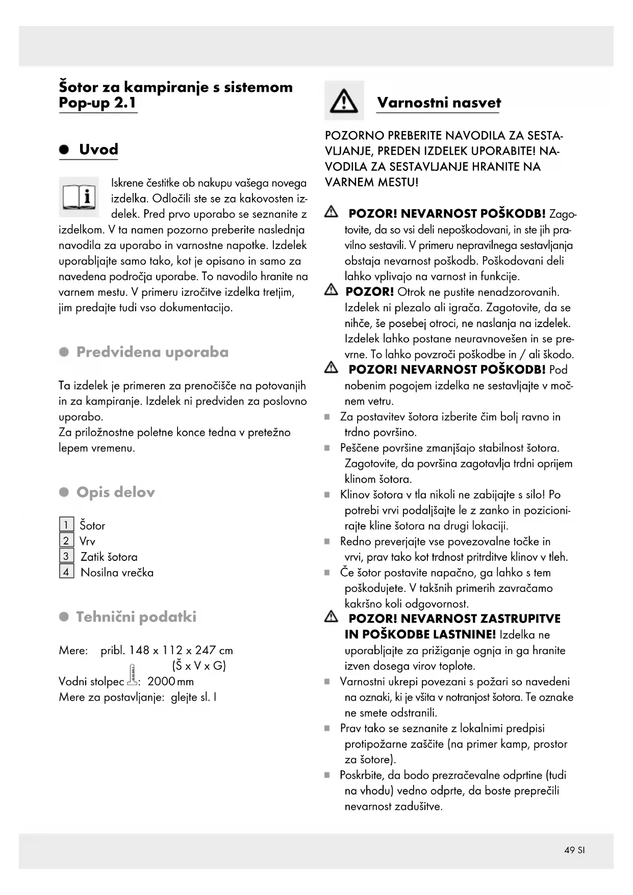 VARNEM MESTU! POZOR! NEVARNOST POŠKODB! Zago- tovite, da so vsi deli nepoškodovani, in ste jih pra- vilno sestavili. V primeru nepravilnega sestavljanja obstaja nevarnost poškodb. Poškodovani deli lahko vplivajo na varnost in funkcije. POZOR! Otrok ne pustite nenadzorovanih. Izdelek ni plezalo ali igrača. Zagotovite, da se nihče, še posebej otroci, ne naslanja na izdelek. Izdelek lahko postane neuravnovešen in se pre- vrne. To lahko povzroči poškodbe in / ali škodo. POZOR! NEVARNOST POŠKODB! Pod nobenim pogojem izdelka ne sestavljajte v moč- nem vetru. Za postavitev šotora izberite čim bolj ravno in trdno površino. Peščene površine zmanjšajo stabilnost šotora. Zagotovite, da površina zagotavlja trdni oprijem klinom šotora. Klinov šotora v tla nikoli ne zabijajte s silo! Po potrebi vrvi podaljšajte le z zanko in pozicioni- rajte kline šotora na drugi lokaciji. Redno preverjajte vse povezovalne točke in vrvi, prav tako kot trdnost pritrditve klinov v tleh. Če šotor postavite napačno, ga lahko s tem poškodujete. V takšnih primerih zavračamo kakršno koli odgovornost.