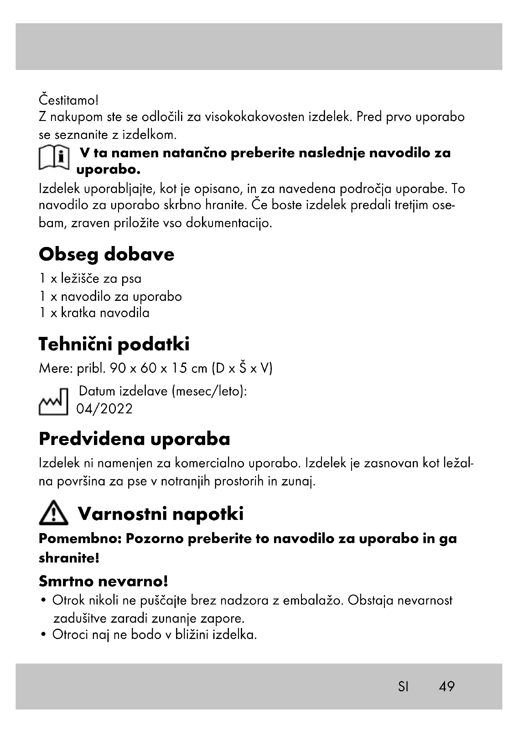 - Izdelek je dovoljeno uporabljati le v skladu s predvidenim namenom. Uporaba (slika A) Izdelek ima grelno in hladilno površino. Hladilna površina: mali vzorec Grelna površina: veliki vzorec Napotek: Grelna površina vsebuje folijo, ki šelesti. Posebna folija odbija oddano telesno toploto psa. Hladilna stran absorbira telesno toploto psa. Čiščenje in nega Če izdelka ne uporabljate, ga shranite na suho, čisto mesto pri sobni tempe- raturi. Izdelek redno stresajte in sesajte. Izdelka ne čistite z agresivnimi čistil- nimi sredstvi. Grobe nečistoče lahko odstranite z vlažno krpo za čiščenje. Za boljše čiščenje lahko izdelek odprete z zadrgo in odstranite notranjo blazino. Po čiščenju pustite, da se v celoti posuši in nato ponovno vstavite notranjo blazino. Prevleka za blazino: SI51SI Napotki za odlaganje v smeti Izdelek in embalažne materiale zavrzite v skladu z aktualnimi lokalnimi predpisi. Embalažni materiali, npr. folijske vrečke, ne sodijo v roke otrok. Embalažni material shranite otrokom nedosegljivo. Izdelke in embalažo odstranite okolju prijazno. Koda za recikliranje označuje različne materiale za vračanje v reciklirni krog. Vsebuje simbol za recikliranje, ki označuje reciklirni krog, in številko, ki označuje material. Napotki za garancijo in izvajanje servisne storitve Izdelek je bil izdelan z veliko skrbnostjo in pod stalno kontrolo. DELTA-SPORT HANDELSKONTOR GmbH zasebnim končnim kupcem od datuma nakupa (garancijskega obdobja) v skladu z naslednjimi določbami odobri triletno garancijo na to postavko. Garancija velja samo za napake v materialu in obdelavi. Garancija ne velja za dele, ki so podvrženi običajni obrabi in jih je zato treba šteti za obrabljive dele (npr. baterije), in za lomljive dele, kot so npr. stikala, akumulatorji ali deli iz stekla. Zahtevki iz te garancije so izključeni, če je bil izdelek uporabljen nepravil- no ali pretirano ali če ni bil uporabljen v okviru predvidenega namena ali predvidenega obsega uporabe ali če niso bile upoštevane specifikacije v na- vodilih za uporabo, razen če končni kupec lahko dokaže, da gre za napako v materialu ali izdelavi, ki ne temelji na eni od zgoraj navedenih okoliščin.52 Garancijski zahtevki se lahko uveljavljajo le v garancijskem roku ob predlo- žitvi originalnega računa. Zato originalni račun shranite. Garancijski čas se zaradi morebitnih popravil na podlagi garancije, zakonskega jamstva ali kulance ne podaljša. To velja tudi za zamenjane in popravljene dele. Pri morebitnih reklamacijah se najprej obrnite na spodaj navedeno servisno številko za nujne primere ali stopite z nami v stik po elektronski pošti. Če obstaja garancijski primer, vam bomo izdelek po naši izbiri brezplačno popravili, zamenjali ali pa vam bomo povrnili kupnino. Druge pravice iz garancije ne obstajajo. Ta garancija ne omejuje vaših zakonskih pravic, še posebej garancijskih zahtevkov do prodajalca. IAN: 378710_2110 Servis Slovenija Tel.: 080080917 E-Mail: deltasport@lidl.si SI53SI Garancijski list