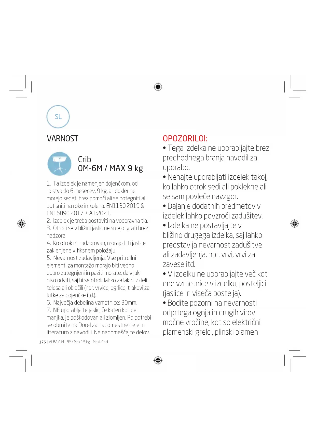 Maxi-Cosi pri roki naslednje podatke: – Serijsko številko – Starost (višino) in težo otroka. Garancija Naša 24-mesečna garancija odraža naše zaupanje v visoko kakovost oblikovanja, inženiringa, proizvodnje in učinkovitost naših izdelkov. Zagotavljamo vam, da je izdelek v skladu s trenutno veljavnimi evropskimi varnostnimi zahtevami in standardi kakovosti, ki se uporabljajo za ta izdelek in da je izdelek v času nakupa brez napak na materialih ali pri izdelavi. Pod omenjenimi pogoji se lahko potrošniki sklicujejo na to garancijo v državah, kjer je bil izdelek prodan pri hčerinski družbi skupine Dorel ali pri pooblaščenem distributerju ali prodajalcu. Naša 24-mesečna garancija pokriva vse proizvodne napake na materialih in pri izdelavi, če izdelek uporabljate v normalnih pogojih in v skladu z našimi navodili za uporabo in sicer za obdobje 24 mesecev od datuma nakupa s strani prvega končnega uporabnika. V primeru zahtevka za popravila ali nadomestne dele za napake na materialih ali pri izdelavi v času garancijskega roka, morate predložiti dokazilo o nakupu, ki je bil opravljen 24 mesecev pred uveljavljanjem garancije. Naša 24-mesečna garancija ne pokriva škode, ki nastane zaradi običajne obrabe, škode, ki nastane zaradi nesreč, nepravilne uporabe, malomarnosti, požara, stika s tekočino ali drugega zunanjega vzroka, škode, ki je posledica neupoštevanja navodil za uporabo, škode, ki nastane zaradi uporabe z drugim izdelkom, škode zaradi servisa, ki ga opravi nepooblaščena oseba, v primeru, če je bil izdelek ukraden ali če je bila z izdelka odstranjena ali spremenjena katerakoli nalepka ali identifikacijska številka. Primeri običajne obrabe vključujejo kolesa in obrabo tekstilne prevleke zaradi redne uporabe kot tudi naravno obledelost barv in materialov zaradi običajnega staranja izdelka. Kaj storiti v primeru napak: Če se pojavijo težave ali napake, je vaša prva kontaktna točka naš pooblaščeni distributer ali prodajalec, ki prizna našo SLMaxi-Cosi