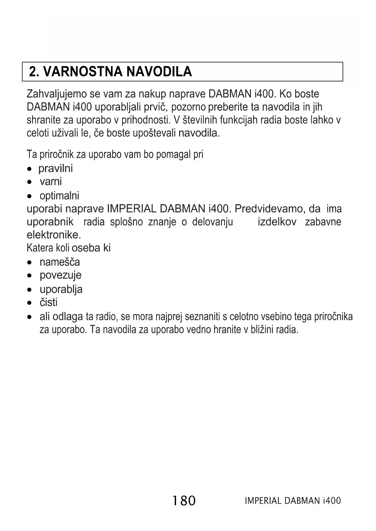 optimalni uporabi naprave IMPERIAL DABMAN i400. Predvidevamo, da ima uporabnik radia splošno znanje o delovanju izdelkov zabavne elektronike. Katera koli oseba ki