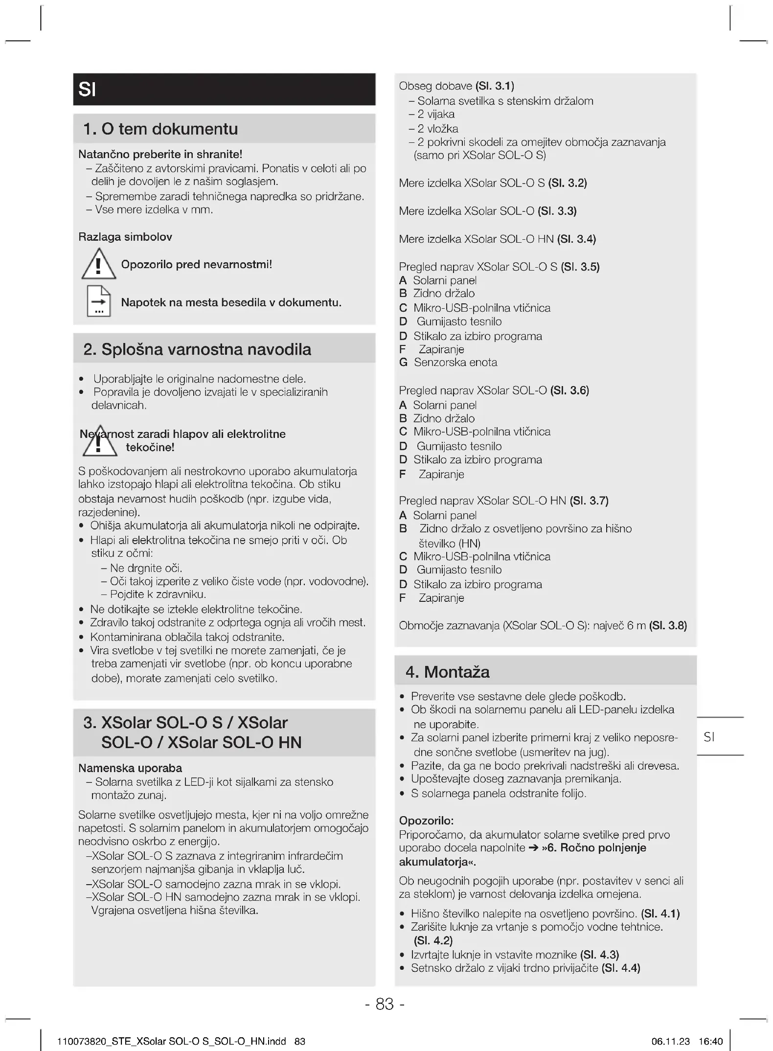 - Solarni panel obrišite z mehko krpo in blagim čistilom. 110073820_STE_XSolar SOL-O S_SOL-O_HN.indd 84110073820_STE_XSolar SOL-O S_SOL-O_HN.indd 84 06.11.23 16:4006.11.23 16:40- 85 - 8 Odstranjevanje Električne aparate, opremo in embalažo oddajte v okolju prijazno ponovno obdelavo. Električnih aparatov ne odstranjujte s hišnimi odpadki!Samo za države članice EUV skladu z veljavno Evropsko direktivo o izrabljenih električnih in elektronskih aparatih in njenim prenosom v nacionalno zakonodajo je električne aparate, ki niso več uporabni, treba zbirati ločeno in jih oddati v okolju prijazno ponovno obdelavo. Odsluženih naprav, akumulatorjev in baterij ne odlagajte med gospodinjske odpadke, v ogenj ali vodo. Akumulatorje/baterije morate zbirati, reciklirati ali zavreči na okolju prijazen način. Samo za države članice EUSkladno z Direktivo RL 2006/66/ES je treba okvarjene ali izrabljene akumulatorje/baterije reciklirati. Odslužene akumulatorje/baterije lahko oddate na prodajnih mestih ali na zbirališčih za nevarne odpadke. 9 Garancija proizvajalca Garancija proizvajalca STEINEL GmbH, Dieselstraße 80-84, DE-33442 Herzebrock-Clarholz, NemčijaTa proizvod podjetja je bil izdelan z veliko skrbnostjo, pre-verjen glede delovanja in varnosti po veljavnih predpisih ter končno podvržen naključni kontroli. Steinel daje garancijo za brezhibno stanje in funkcionalnost proizvoda. Garancija velja 36mesecev od dneva nakupa in se začne z dnem prodaje izdelka stranki. Odstranjujemo pomanjkljivosti, ki so posledica napak v materialu ali izdelavi, obveznost garancije pa je izpolnjena ob popravilu ali menjavi delov z napakami po naši izbiri. Garancija ne velja pri poškodbah obrabnih delov in za ško-de in pomanjkljivosti, do katerih je prišlo zaradi nepravilne uporabe ali vzdrževanja. Nadaljnje poškodbe na drugih predmetih so izključene. Garancija bo odobrena v primeru, da pošljete nerazstavljeno napravo s kratkim opisom napa-ke ter potrdilom o nakupu oz. računom (datum nakupa in štampiljka trgovca), dobro zapakirano na ustrezne servisne službe. Servis za popravila: Po poteku garancijske dobe ali pri napakah brez garancijske pravice se posvetujte z našim servisnim obratom glede popravila. 10 Tehnični podatki Tehnični podatki solarne svetilke XSolarSOL-OS XSolarSOL-O XSolarSOL-O≈HNMere Š×V×G(vmm) 242×53×91 242×38×91 242×183×91Zmogljivost maks. 3,3W maks. 0,1W maks. 0,1WKot zaznavanja 360° - -Doseg zaznavanja maks. 6m - -Nastavitev zatemnitve 2luksa Nastavitev časa 10 – 30s samodejno - - Nočna luč 3% - - Svetlobni tok maks. 273lm maks. 7,5lm maks. 7,5lm Učinkovitost 83lm/W 75lm/W 75lm/W Temperatura barve 3.000KUporabna doba LED 50.000hVrsta zaščite IP44Razred zaščite IIITemperaturno območje -20°Cdo40°C Tehnični podatki akumulator XSolarSOL-OS XSolarSOL-O XSolarSOL-OHN Tip Litij-železo-fosfat (LiFePO4)Zmogljivost 2×2.000mAH 2.000mAH 2.000mAHMaks. življenjska doba 20dnipri20vklopih na nočMikro-USB-polnilna vtičnica 5V,maks.1A PROIZVAJALCA