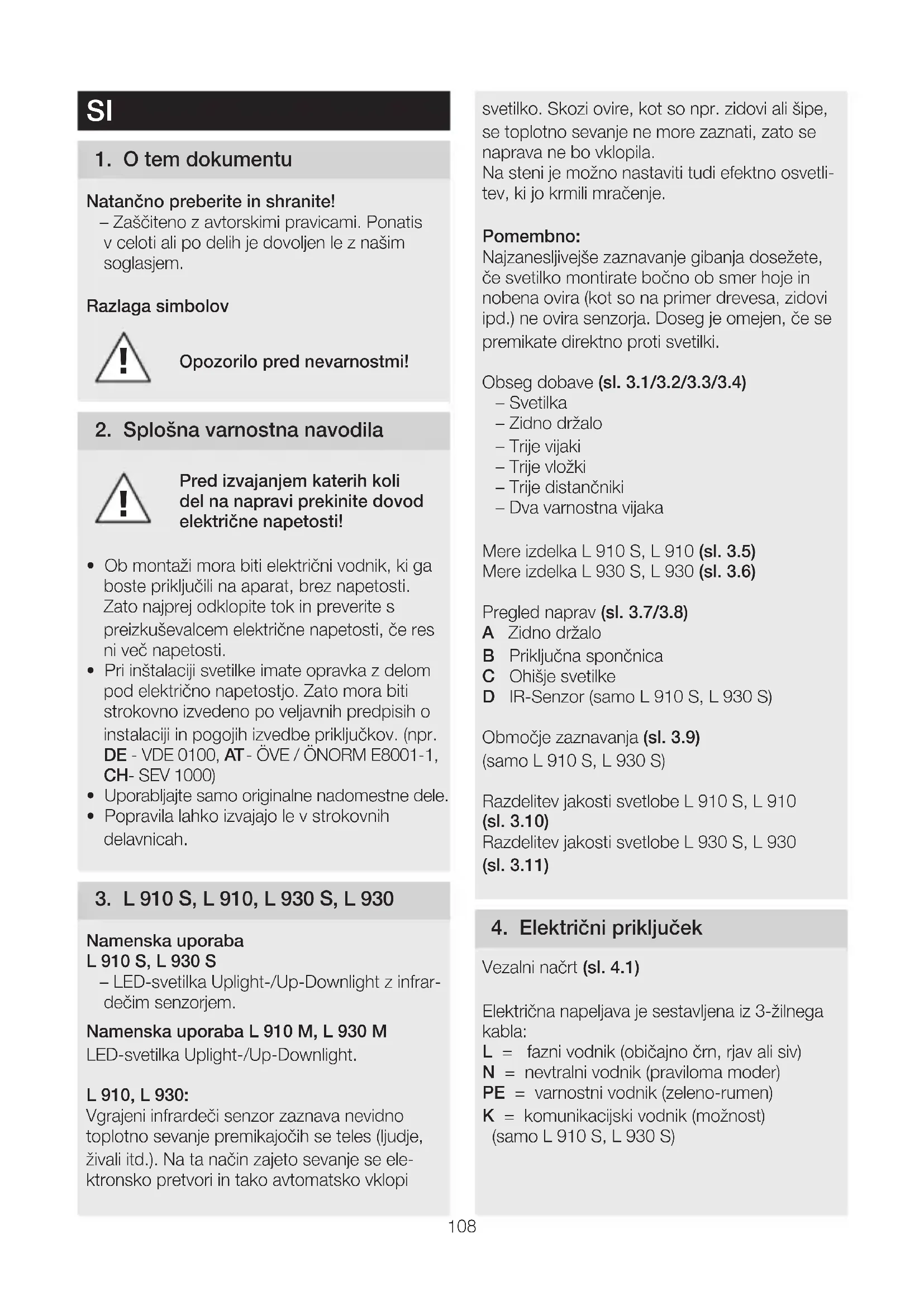 - Popravila lahko izvajajo le v strokovnih delavnicah. 3 L910S, L910, L930S, L930 Namenska uporaba L910S, L930S – LED-svetilka Uplight-/Up-Downlight z infrar- dečim senzorjem. Namenska uporaba L910M, L930M LED-svetilka Uplight-/Up-Downlight. L910, L930: Vgrajeni infrardeči senzor zaznava nevidno toplotno sevanje premikajočih se teles (ljudje, živali itd.). Na ta način zajeto sevanje se ele- ktronsko pretvori in tako avtomatsko vklopi svetilko. Skozi ovire, kot so npr. zidovi ali šipe, se toplotno sevanje ne more zaznati, zato se naprava ne bo vklopila. Na steni je možno nastaviti tudi efektno osvetli- tev, ki jo krmili mračenje. Pomembno: Najzanesljivejše zaznavanje gibanja dosežete, če svetilko montirate bočno ob smer hoje in nobena ovira (kot so na primer drevesa, zidovi ipd.) ne ovira senzorja. Doseg je omejen, če se premikate direktno proti svetilki. Obseg dobave (sl 31/32/33/34) – Svetilka – Zidno držalo – Trije vijaki – Trije vložki – Trije distančniki – Dva varnostna vijaka Mere izdelka L910S, L910 (sl 35) Mere izdelka L930S, L930 (sl 36) Pregled naprav (sl 37/38) A Zidno držalo B Priključna spončnica C Ohišje svetilke D IR-Senzor (samoL910S, L930S) Območje zaznavanja (sl39) (samoL910S, L930S) Razdelitev jakosti svetlobe L910S, L910 (sl 310) Razdelitev jakosti svetlobe L930S, L930 (sl 311) 4 Električni priključek Vezalni načrt (sl 41) Električna napeljava je sestavljena iz 3-žilnega kabla: L = fazni vodnik (običajno črn, rjav ali siv) N = nevtralni vodnik (praviloma moder) PE = varnostni vodnik (zeleno-rumen) K = komunikacijski vodnik (možnost) (samo L910S, L930S)109 V primeru dvoma morate napeljave identificirati z indikatorjem napetosti; nato ga ponovno preklopite na stanje brez napetosti. Fazo (L) in nevtralni vodnik (N) priključite na priključno sponko, zaščitni vodnik (PE) pa na sponko (E). (Sl 55/56) Pomembno: Pomešanje priključkov lahko privede kasneje v aparatu ali električni omarici do kratkega stika. V tem primeru morate vse napeljave znova identificirati in na novo povezati. Na omrežni kabel lahko seveda inštalirate omrežno stikalo za vklop in izklop. Vira svetlobe v tej svetilki ne morete zamenjati; če je treba zamenjati vir svetlobe (npr. ob koncu uporabne dobe), morate zamenjati celo svetilko. Skupinsko vedenje Prek komunikacijskega voda (K) je možna interna skupinska povezava v omrežje STEINEL med L910S, L930S. V ta namen odlomite prekrivno zaplato v priključnem delu. (Sl42) V omrežje lahko povežete maks. 10 svetilk. Najdaljša dolžina komunikacijske napeljave je lahko 50 m. Prva svetilka skupine, ki zazna gibanje, VKLOPI celotno skupino. Če po poteku nastavljenega časa ni zaznanih dodatnih gibanj, zadnja svetil- ka v skupini IZKLOPI celotno skupino. Napotek: – Komunikacijska napeljava ne sme biti obremenjena z napetostjo. Ne priklopite zunanjih bremen! – Znotraj skupinskega omrežja sledijo vse svetilke svojim individualnim vrednostim, nastavljenim na stikalu DIP. – V testnem načinu skupinsko omrežje ni možno. 5 Montaža