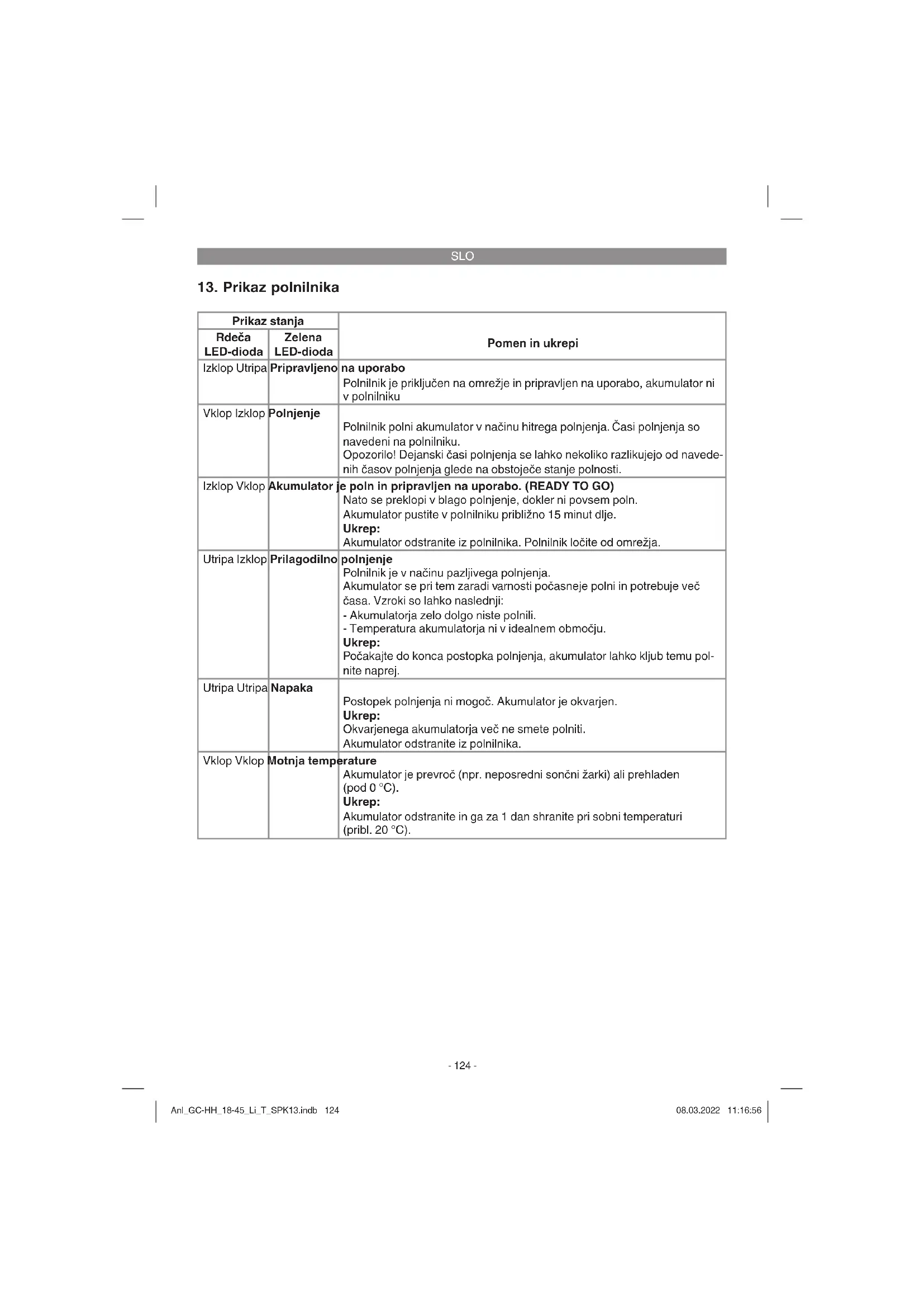 Prikaz stanja Pomen in ukrepi Rdeča LED-dioda Zelena LED-dioda Izklop Utripa Pripravljeno na uporabo Polnilnik je priključen na omrežje in pripravljen na uporabo, akumulator ni v polnilniku Vklop Izklop Polnjenje Polnilnik polni akumulator v načinu hitrega polnjenja. Časi polnjenja so navedeni na polnilniku. Opozorilo! Dejanski časi polnjenja se lahko nekoliko razlikujejo od navede- nih časov polnjenja glede na obstoječe stanje polnosti. Izklop Vklop Akumulator je poln in pripravljen na uporabo. (READY TO GO) Nato se preklopi v blago polnjenje, dokler ni povsem poln. Akumulator pustite v polnilniku približno 15 minut dlje. Ukrep: Akumulator odstranite iz polnilnika. Polnilnik ločite od omrežja. Utripa Izklop Prilagodilno polnjenje Polnilnik je v načinu pazljivega polnjenja. Akumulator se pri tem zaradi varnosti počasneje polni in potrebuje več časa. Vzroki so lahko naslednji: - Akumulatorja zelo dolgo niste polnili. - Temperatura akumulatorja ni v idealnem območju. Ukrep: Počakajte do konca postopka polnjenja, akumulator lahko kljub temu pol- nite naprej. Utripa Utripa Napaka Postopek polnjenja ni mogoč. Akumulator je okvarjen. Ukrep: Okvarjenega akumulatorja več ne smete polniti. Akumulator odstranite iz polnilnika. Vklop Vklop Motnja temperature Akumulator je prevroč (npr. neposredni sončni žarki) ali prehladen (pod 0 °C). Ukrep: Akumulator odstranite in ga za 1 dan shranite pri sobni temperaturi (pribl. 20 °C). Anl_GC-HH_18-45_Li_T_SPK13.indb 124Anl_GC-HH_18-45_Li_T_SPK13.indb 124 08.03.2022 11:16:5608.03.2022 11:16:56SLO