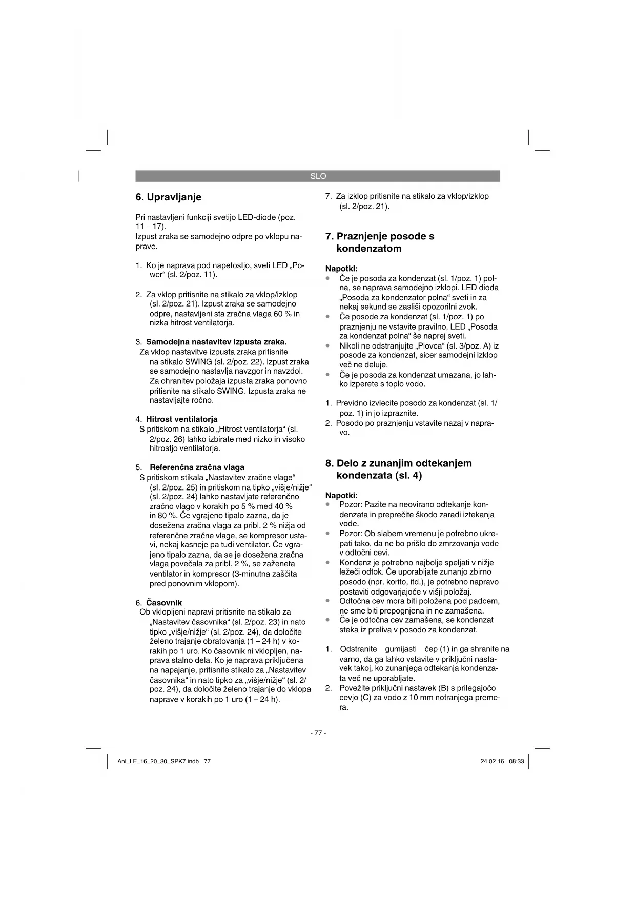 V namen preprečevanja visokih vklopnih tokov je naprava opremljena z zaščito pred ponovnim vklopom, katera vključi kompresor ponovno šele po preteku časa 3 minut. Anl_LE_16_20_30_SPK7.indb 76Anl_LE_16_20_30_SPK7.indb 76 24.02.16 08:3324.02.16 08:33SLO